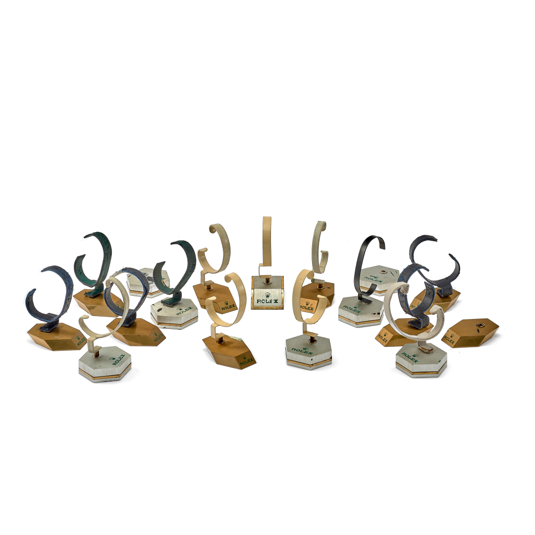 Insieme di vari porta orologi Rolex ref. 508 e 424, basi in metallo poligonali.