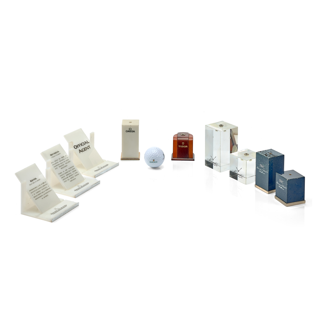 Una palla da golf Rolex Top Elite Magna n. 2; sei espositori porta orologio vari marchi: Tudor, IWC, Omega, Breguet; lotto Omega di targhe in plexiglass dei modelli della maison.