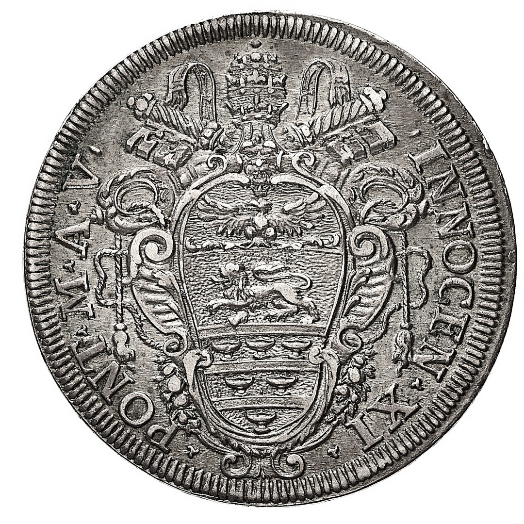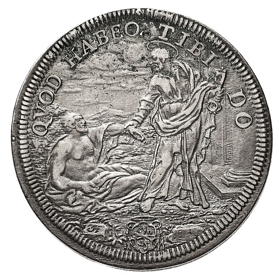 Innocenzo XI (1676-1689) - Testone 1677 Anno V - Zecca: Roma - Diritto: stemma sormontato dalle chiavi decussate seminascoste e dalla tiara - Rovescio: San Pietro stante a destra con le chiavi erette nella mano sinistra si volge all'indietro per sollevare da terra uno storpio - gr. 9,48 - Rara - q.SPL