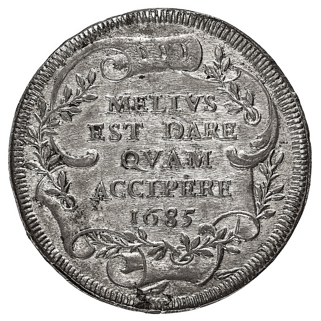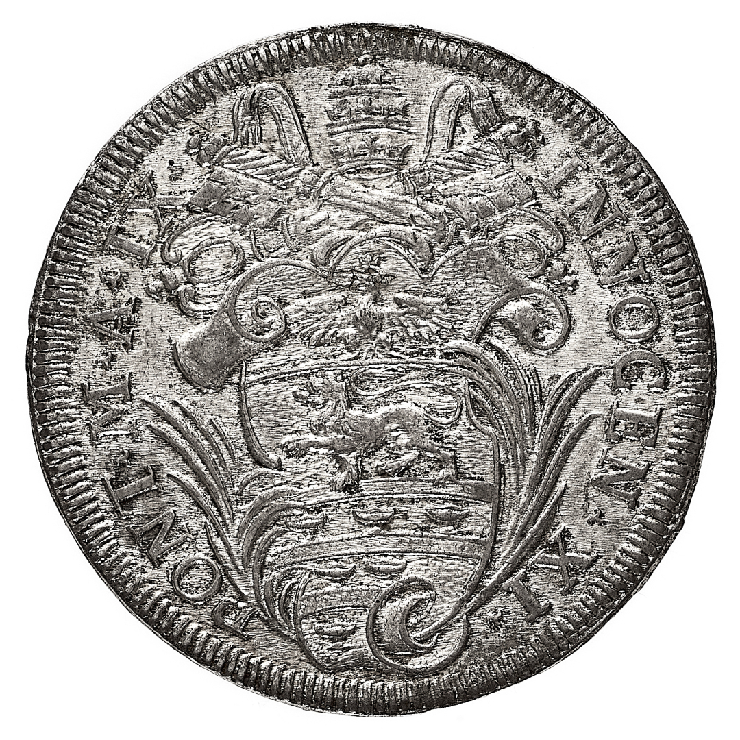 Innocenzo XI (1676-1689) - Testone 1685 Anno IX - Zecca: Roma - Diritto: stemma sormontato dalle chiavi decussate e dalla tiara - Rovescio: motto e data entro cartella ornata di fogliami - gr. 9,15 - SPL