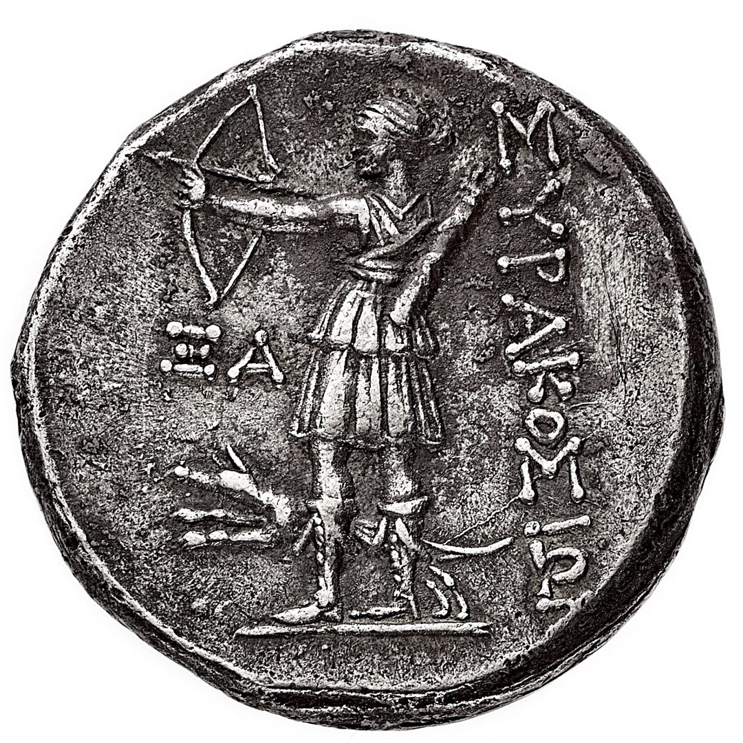 Siracusa - Periodo della Quinta Democrazia (214-212 a.C.) - 12 Litre - Diritto: testa di Atena a sinistra con elmo corinzio - Rovescio: Artemide stante a sinistra mentre tende un arco; ai suoi piedi un cane in corsa verso sinistra - gr. 10,15 - Rara - q.BB