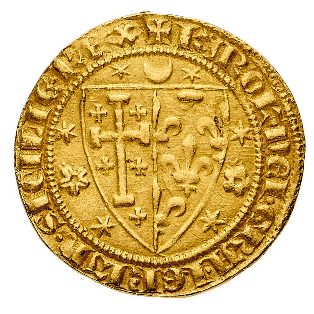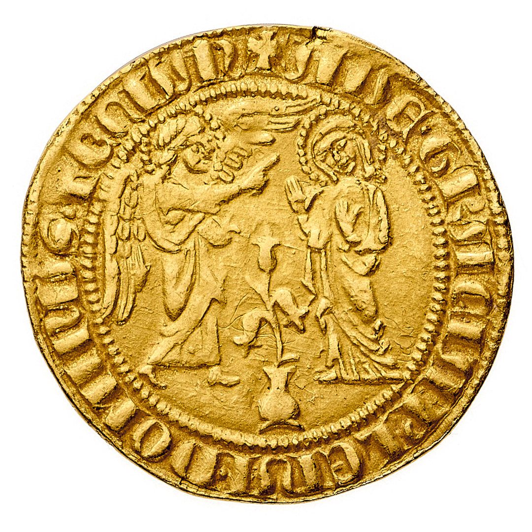 Carlo I d'Angiò (1266-1285) - Saluto d'oro - Zecca: Napoli - Diritto: stemma bipartito di Francia e Gerusalemme sormontato da crescente di luna e circondato da stelle e rosette alternate - Rovescio: l'annunciazione della Vergine; interposta, una pianta di giglio - gr. 4,38 - Rara - Lieve ondulazione del tondello e colpetto al contorno, q.SPL