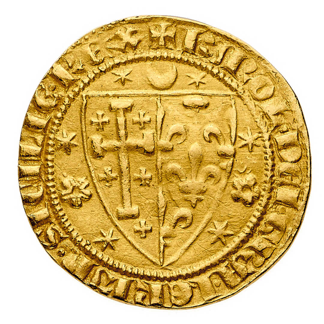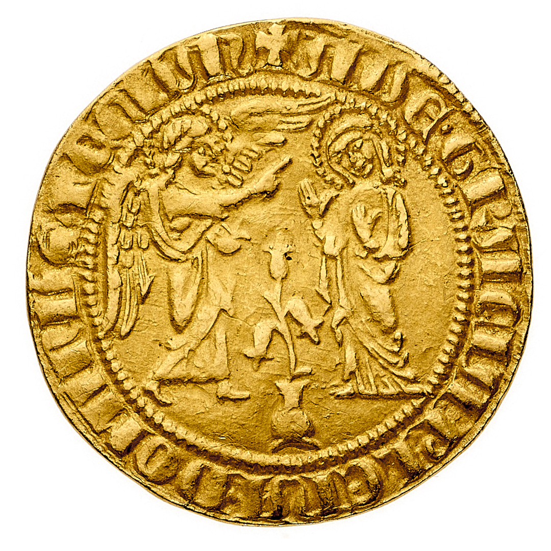 Carlo I d'Angiò (1266-1285) - Saluto d'oro - Zecca: Napoli - Diritto: stemma bipartito di Francia e Gerusalemme sormontato da crescente di luna e circondato da stelle e rosette alternate - Rovescio: l'annunciazione della Vergine; interposta, una pianta di giglio - gr. 4,45 - Rara - Lieve ondulazione del tondello, altrimenti SPL