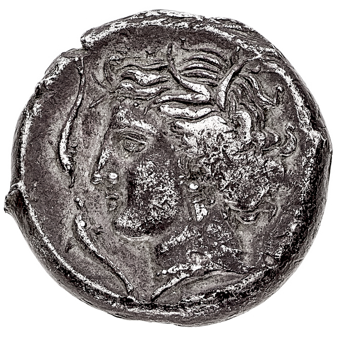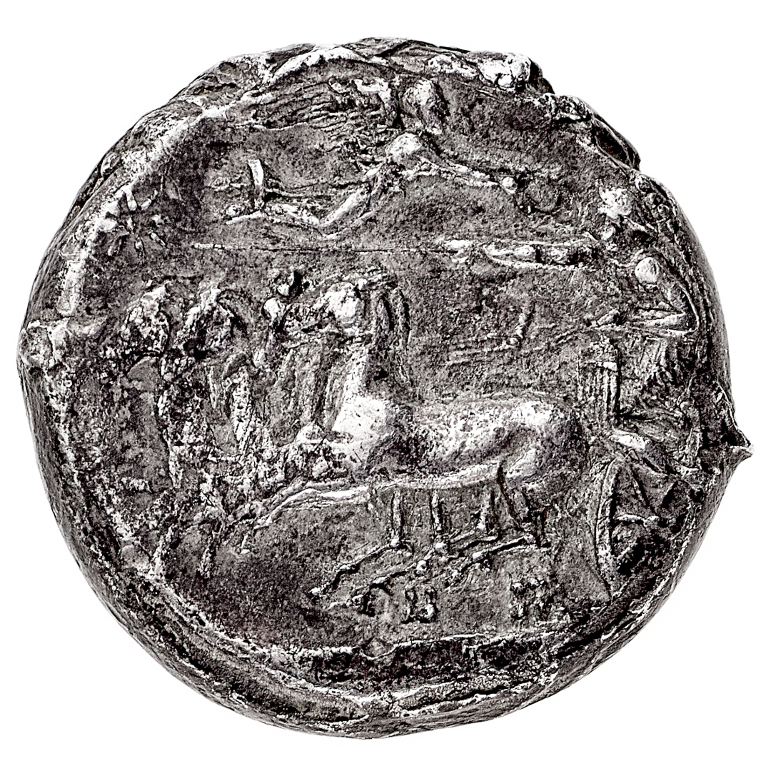 Dominazione punica - Tetradramma databile al periodo 325-300 a.C. - Zecca: Panormos - Diritto: quadriga veloce al galoppo verso sinistra; in alto, nel campo, una Vittoria nell'atto di porgere una corona d'alloro - Rovescio: testa di Tanit a sinistra; attorno quattro delfini - gr. 16,79 - Patina di medagliere, BB