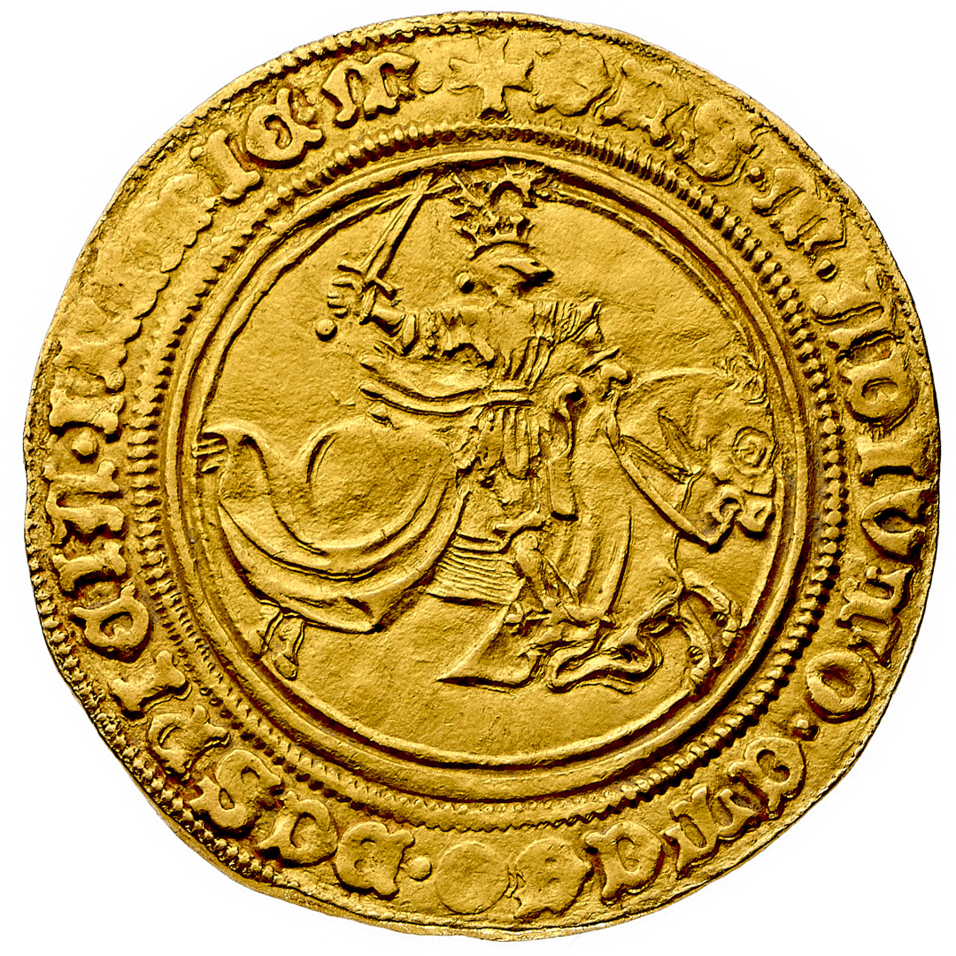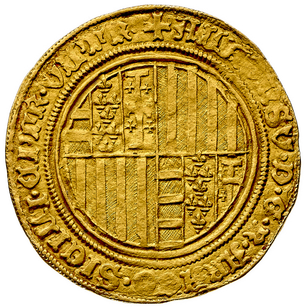 Alfonso I d'Aragona (1442-1458) - Ducato e mezzo o Alfonsino d'oro - Zecca: Napoli - Diritto: stemma inquartato di Napoli e Aragona - Rovescio: Alfonso a cavallo verso destra brandisce una spada con la mano destra - gr. 5,28 - Rara - SPL