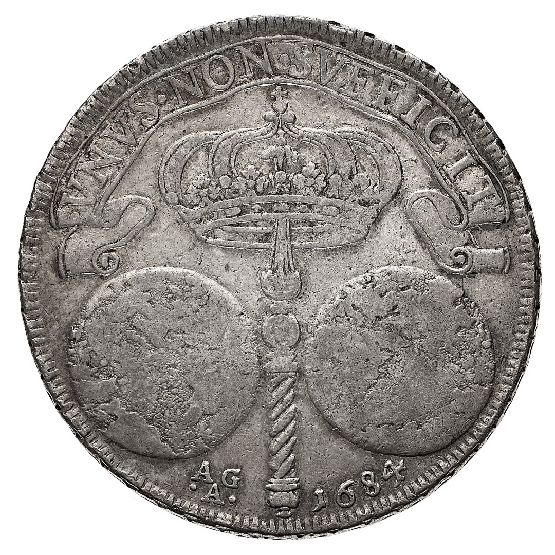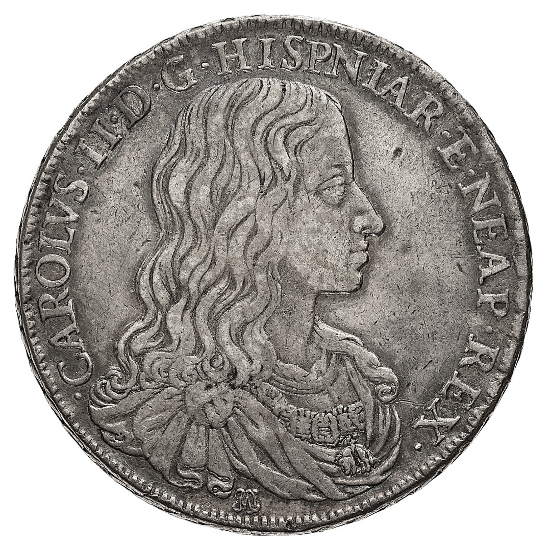 Carlo II di Spagna (1665-1700) - Ducato da 100 Grana 1684 - Zecca: Napoli - Diritto: busto di Carlo II a destra con il Collare del Toson d'Oro - Rovescio: scettro sormontato da corona con ai lati due globi terrestri, di cui uno raffigurante le Americhe e l'altro l'Europa e l'Asia - gr. 27,94 - Patina di medagliere, BB