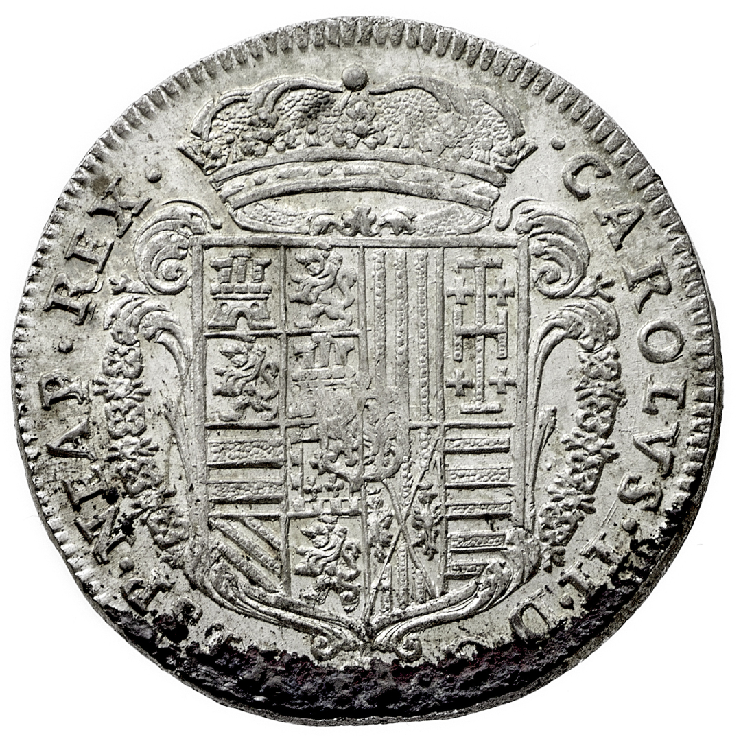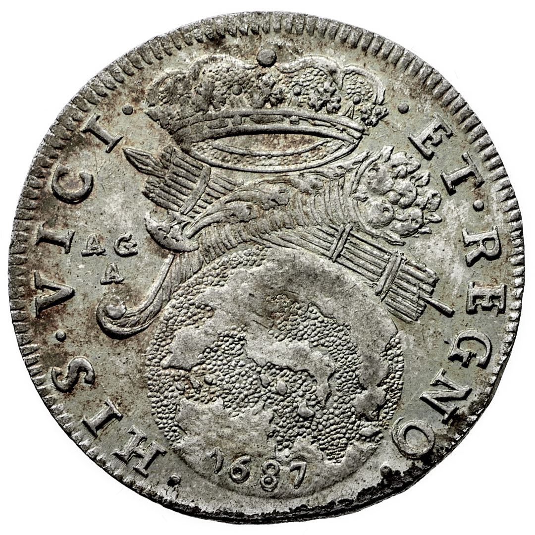 Carlo II di Spagna (1665-1700) - Tarì 1687 - Zecca: Napoli - Diritto: globo coronato sul quale si incrociano una cornucopia e un fascio littorio - Rovescio: stemma coronato e circondato dal Collare del Toson d'Oro - gr. 5,64 - Patina di medagliere, migliore di SPL
