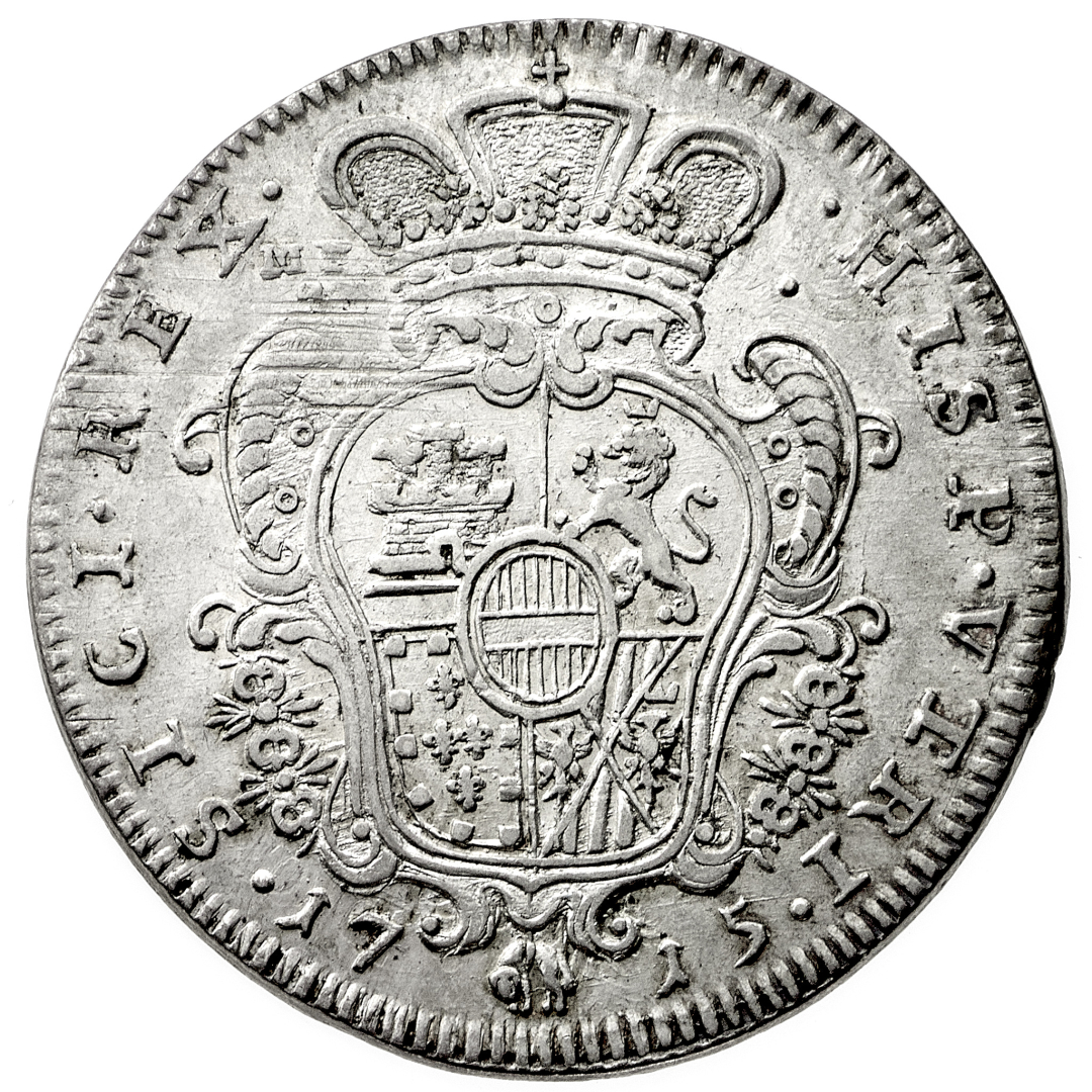Carlo VI Imperatore (1711-1734) - Mezzo Ducato da 5 Carlini 1715 - Zecca: Napoli - Diritto: busto paludato e corazzato di Carlo VI a destra - Rovescio: stemma coronato - gr. 10,96 - Rara - Piacevole patina iridescente sul diritto, q.SPL