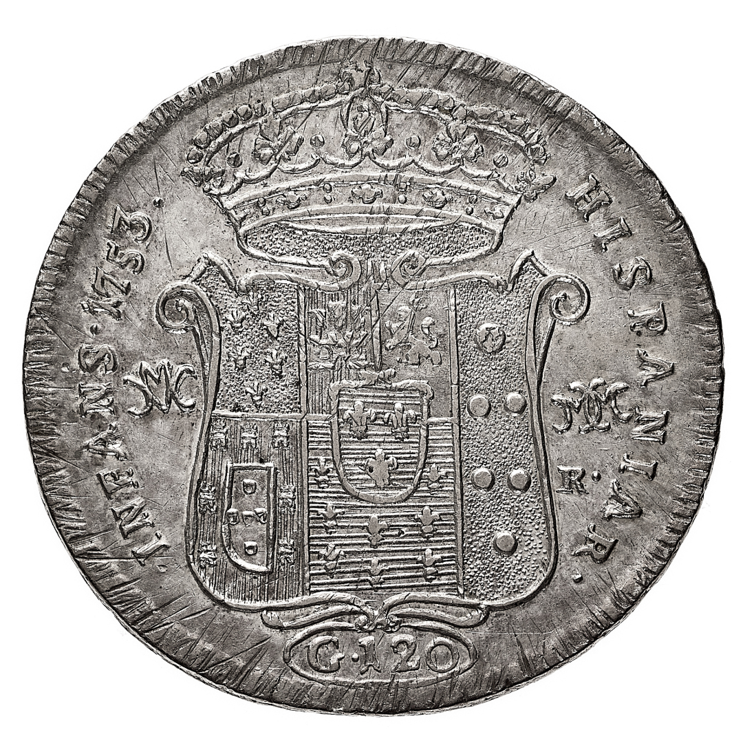 Carlo III di Borbone (1734-1759) - Piastra da 120 Grana 1753 - Zecca: Napoli - Diritto: busto paludato e corazzato del Re a destra - Rovescio: stemma coronato - gr. 25,38 - Splendida patina, q.SPL