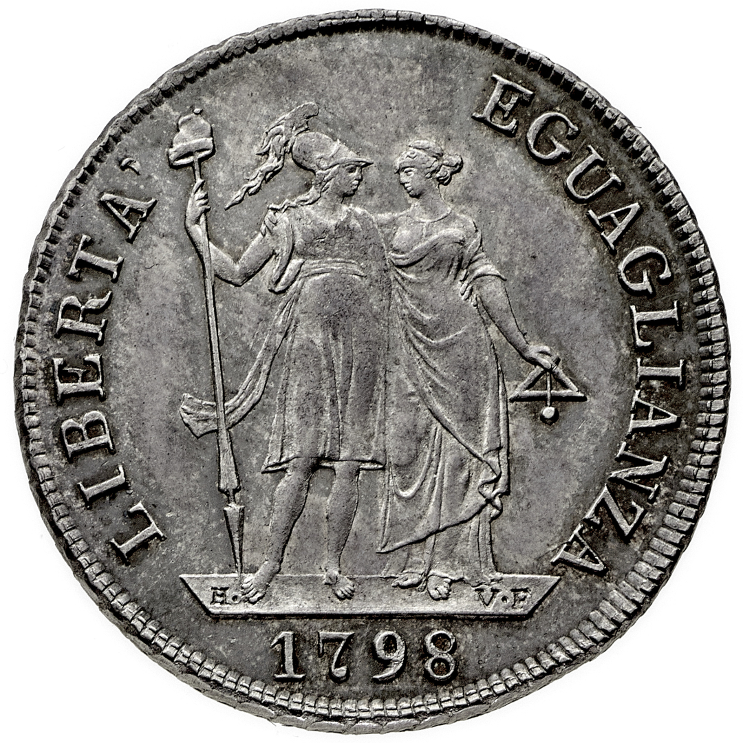 2 Lire 1798 NGC MS 64 - Zecca: Genova - Diritto: stemma di Genova su fascio tra due rami di alloro e di palma - Rovescio: due figure allegoriche stanti con alcuni simboli della Rivoluzione Francese - Proveniente dalla Collezione Mantegazza - Cert. #8585048-015
