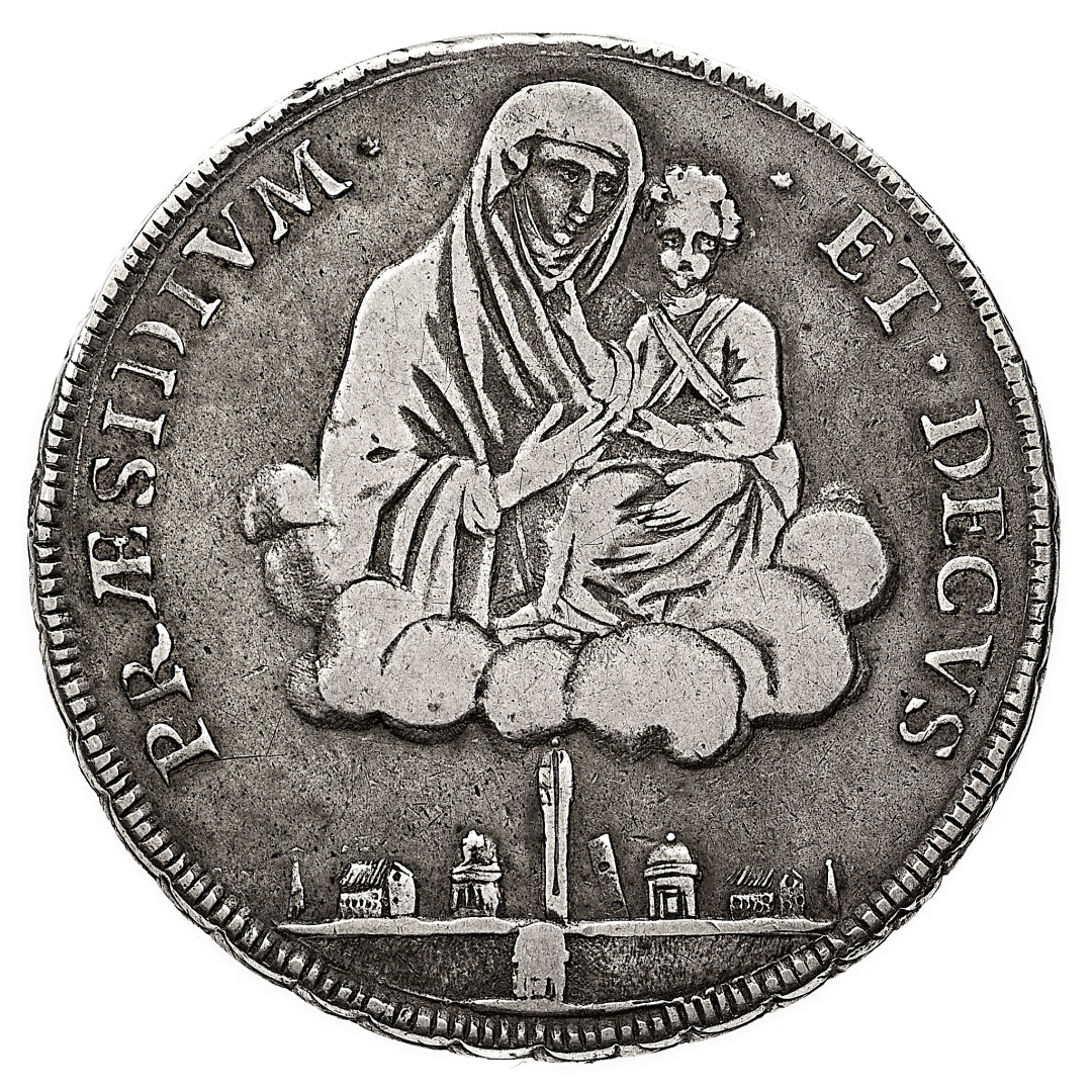 Scudo da 10 Paoli 1797 - Zecca: Bologna - Diritto: stemma sormontato da una testa di leone - Rovescio: la Vergine con il Bambino fra le nubi; sotto veduta della città di Bologna - gr. 28,82 - BB