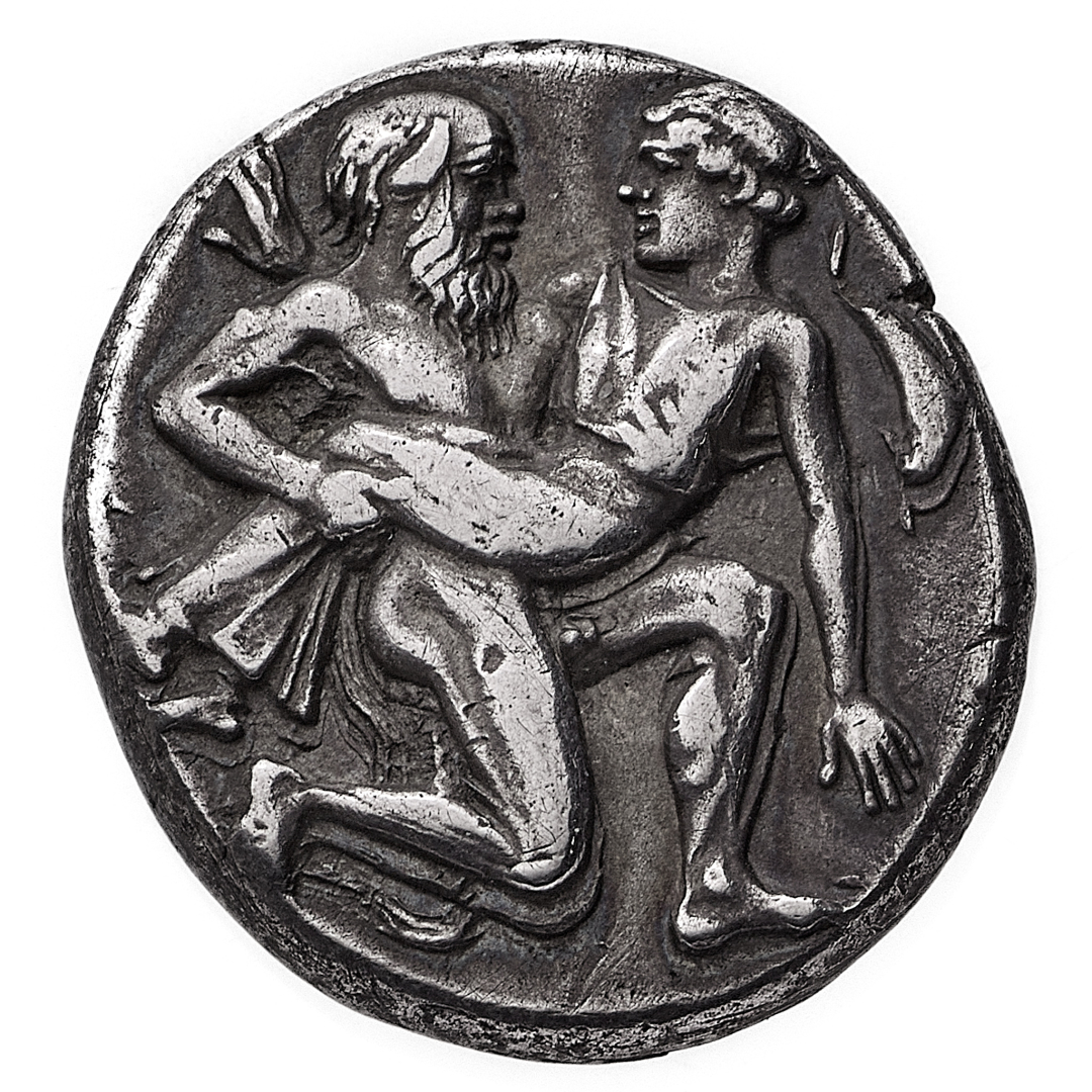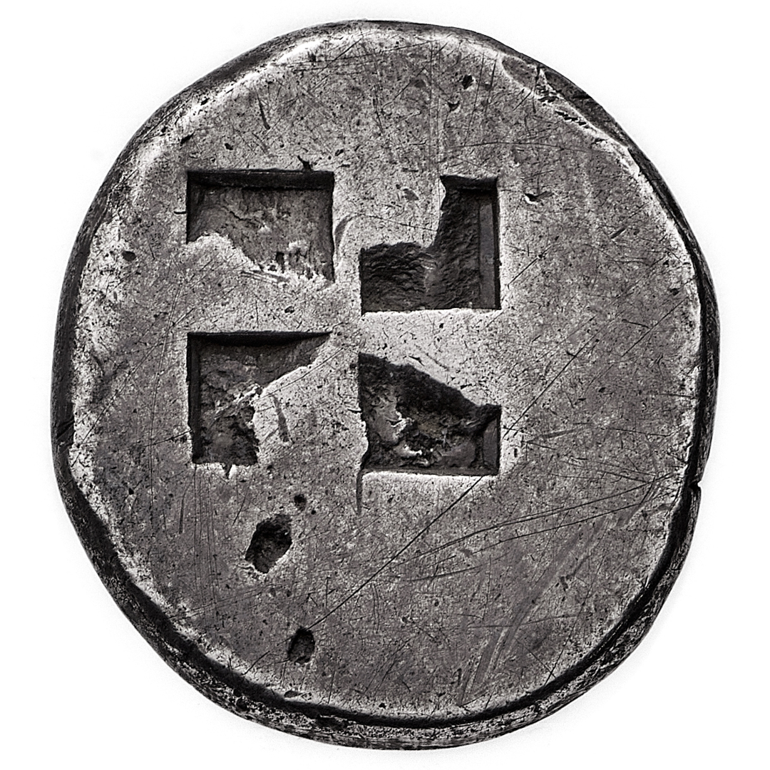 Thasos - Statere databile al periodo 412-404 a.C. - Diritto: satiro nudo sostiene con le braccia una ninfa; in alto, a destra, un delfino - Rovescio: quadrato quadripartito in incuso - gr. 8,59 - BB - Proveniente dall'asta Dr. Busso Peus Nachf. 368, Frankfurt am Main 25.4.2001, n. 117