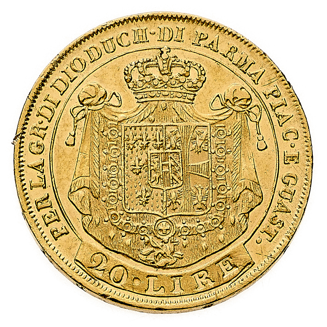 Maria Luigia d'Austria (1815-1847) - 20 Lire 1815 - Zecca: Milano - Diritto: effigie della Duchessa a sinistra - Rovescio: stemma entro padiglione ornato e coronato - gr. 6,45 - Rara - Lievi segni di contatto, q.SPL