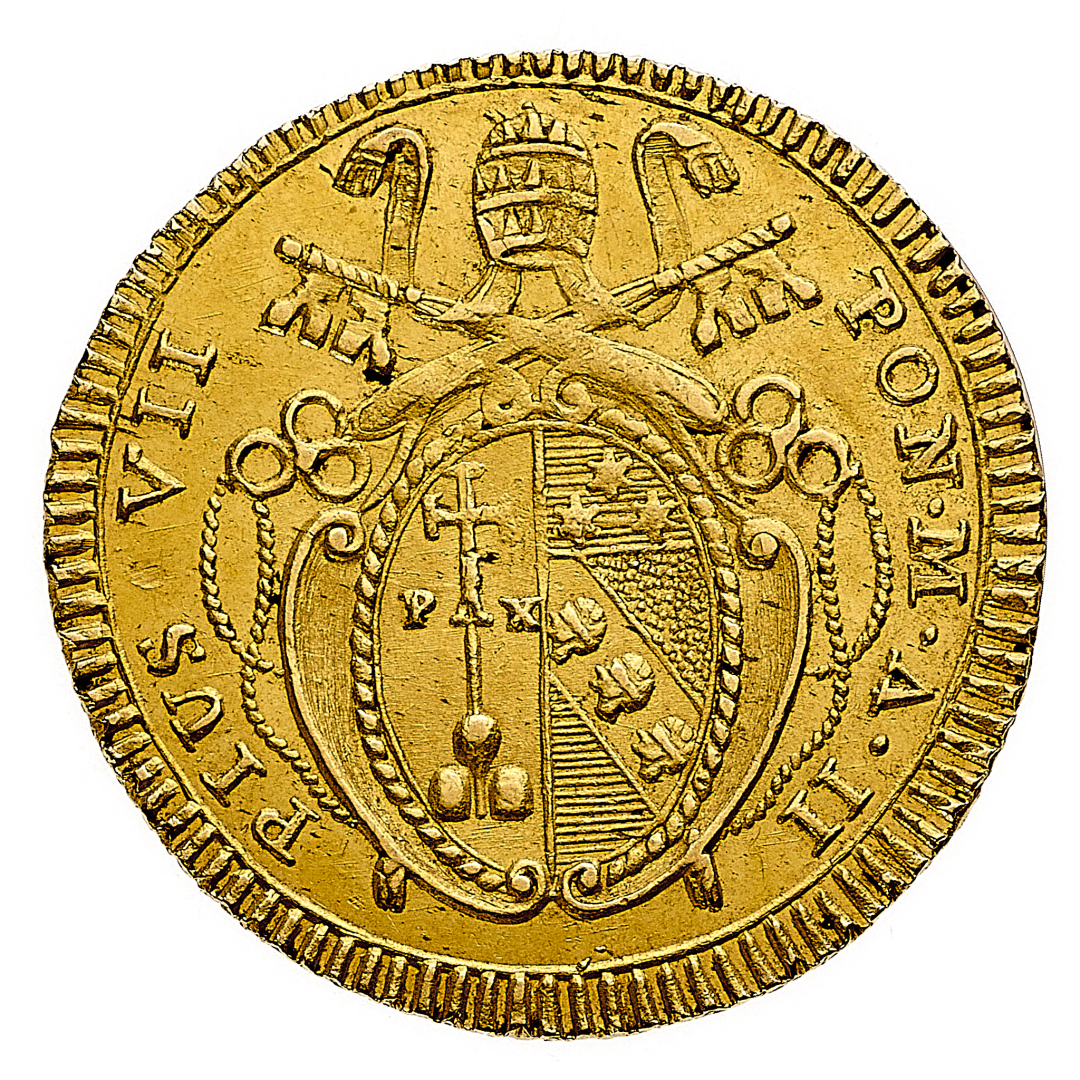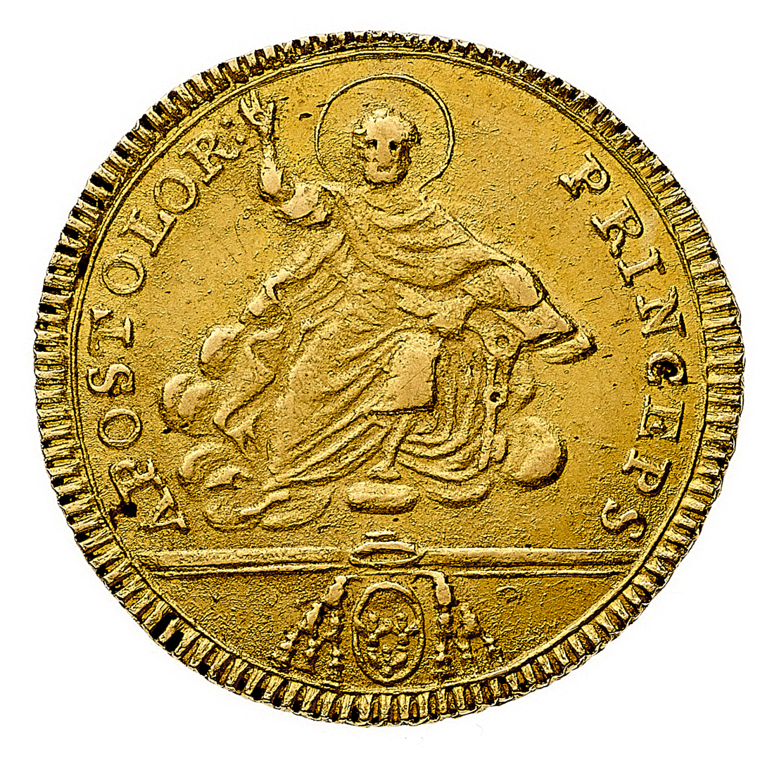 Pio VII (1800-1823) - Doppia Anno II - Zecca: Roma - Diritto: stemma sormontato dalle chiavi decussate e dalla tiara - Rovescio: San Pietro nimbato seduto di fronte sulle nubi, tiene la mano destra alzata benedicente, con la sinistra le chiavi legate e il braccio appoggiato su un libro - gr. 5,38 - Fondi che conservano in parte la lucentezza originale, q.SPL