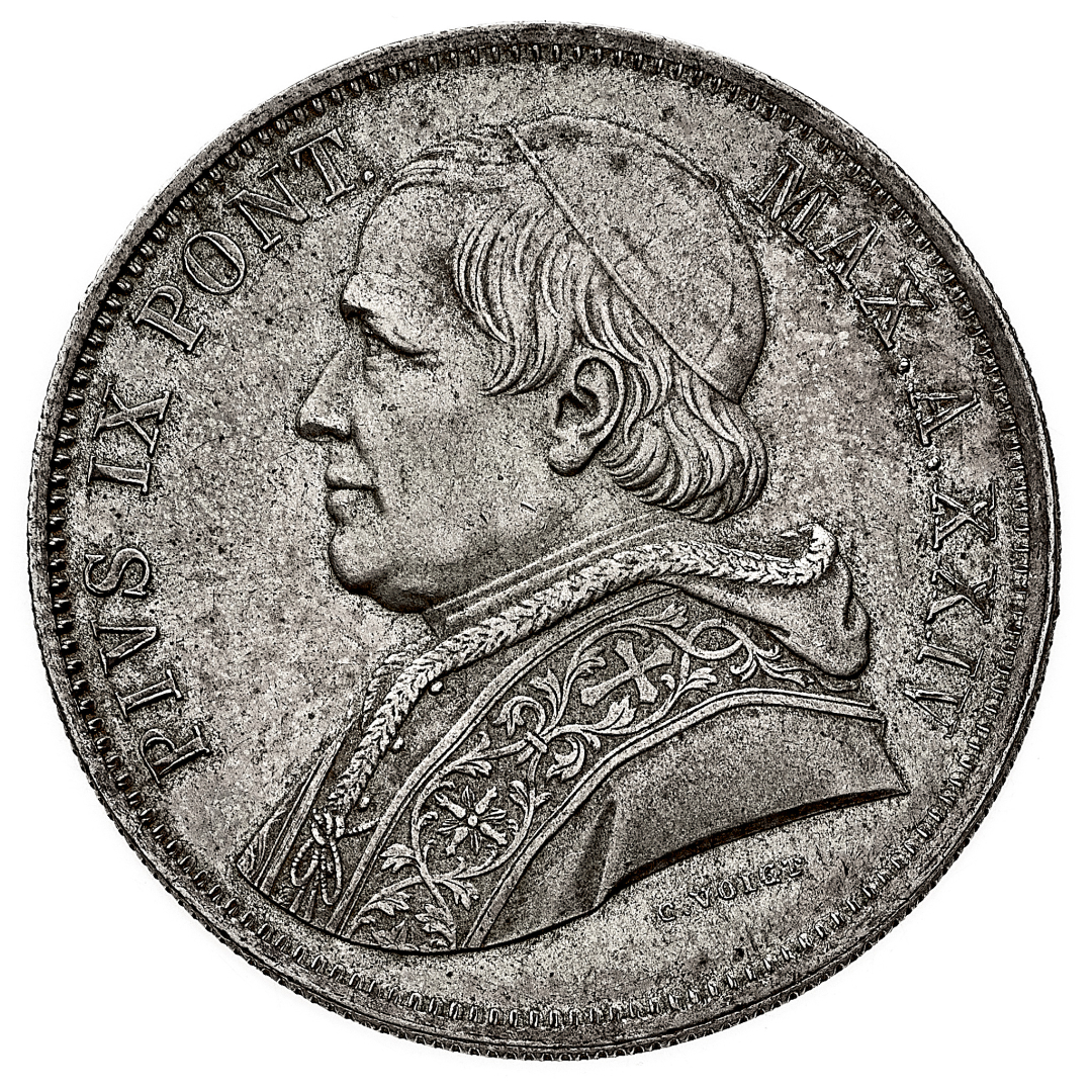 Pio IX (1846-1870) - 5 Lire 1870 Anno XXIV - Zecca: Roma - Diritto: effigie del Papa a sinistra - Rovescio: valore e data entro due rami di alloro e di quercia - gr. 25,00 - Rara - Lievi debolezze di conio, ma con fondi ancora parzialmente lucenti, SPL