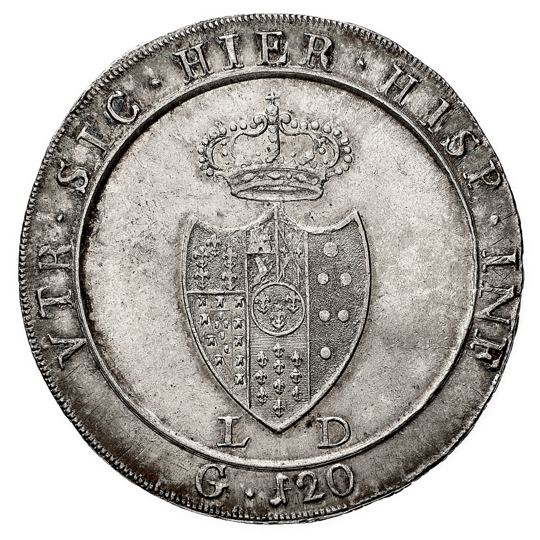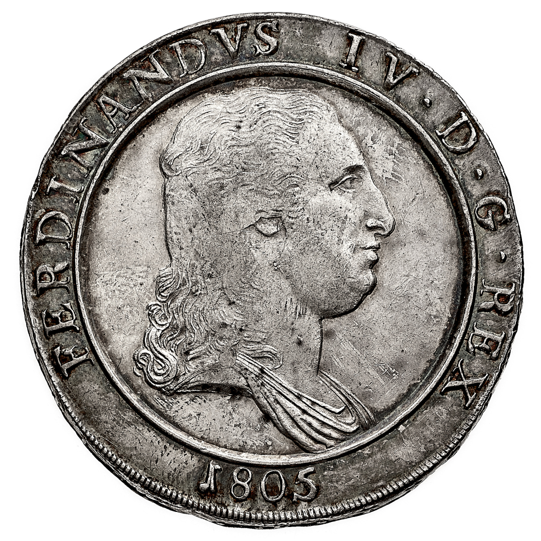 Ferdinando IV di Borbone (1799-1805) - Piastra da 120 Grana 1805 - Zecca: Napoli - Diritto: effigie del Re a destra - Rovescio: stemma coronato - gr. 27,54 - Rara tipologia con capelli lisci - Splendida patina, migliore di SPL