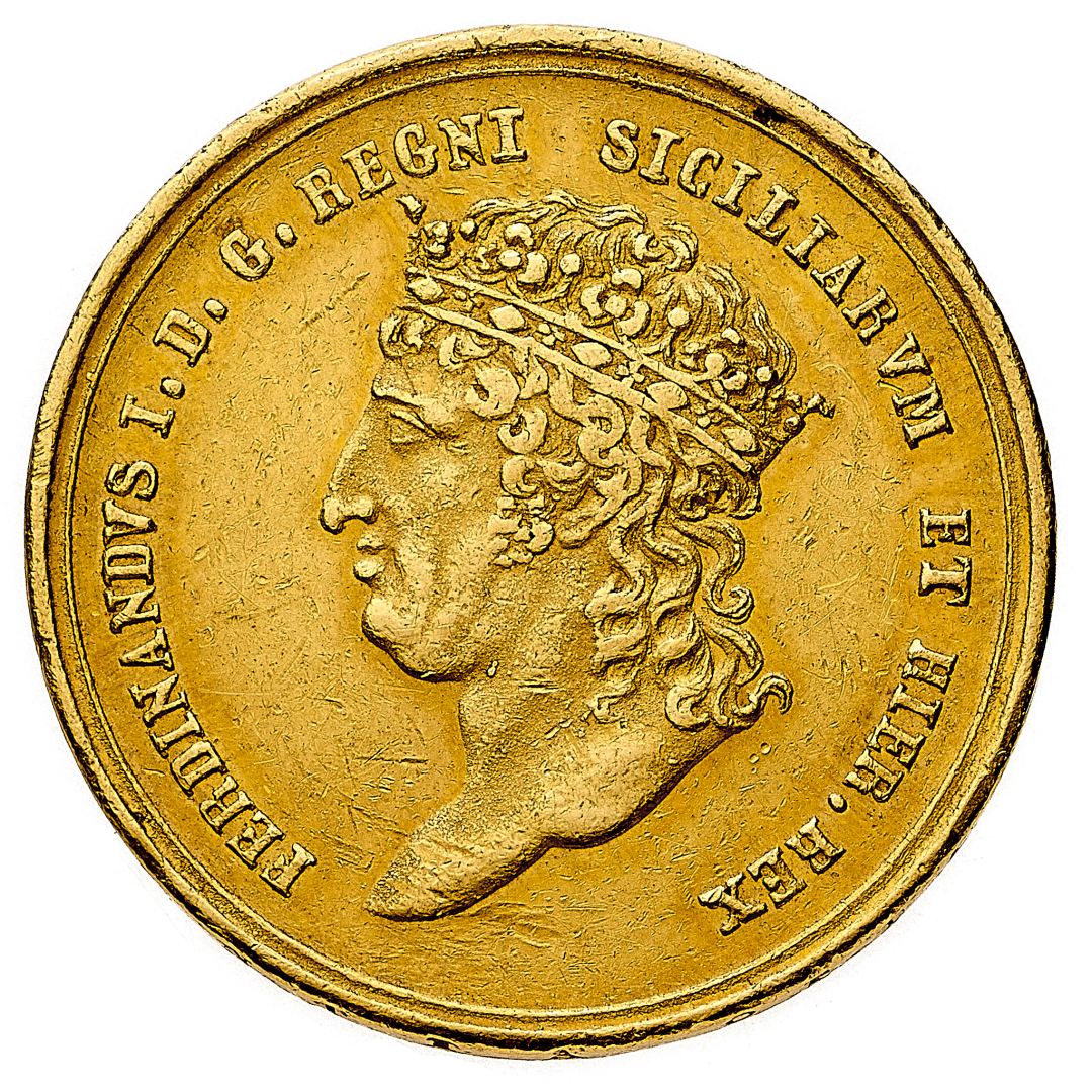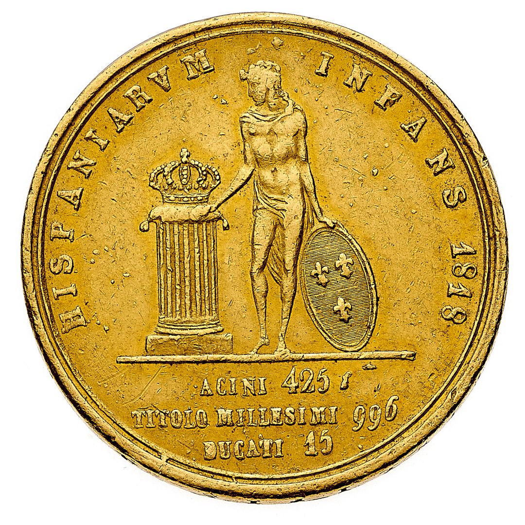 Ferdinando I di Borbone (1816-1825) - 15 Ducati 1818 - Zecca: Napoli - Diritto: effigie coronata del Re a sinistra - Rovescio: il Genio alato stante a sinistra poggia la mano destra su un troncone di colonna coronata e tiene con la sinistra uno scudo ovale con i gigli di Borbone - gr. 18,94 - Non comune - Lievi segni di contatto, migliore di BB