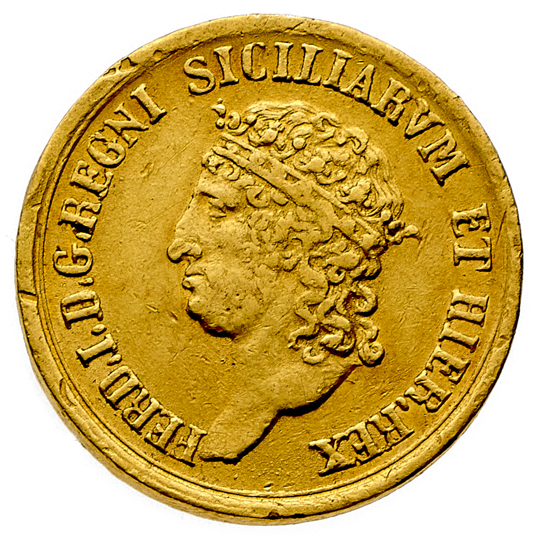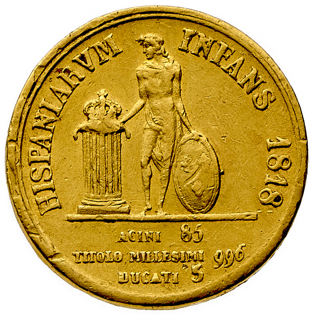 Ferdinando I di Borbone (1816-1825) - 3 Ducati 1818 - Zecca: Napoli - Diritto: effigie coronata del Re a sinistra - Rovescio: il Genio stante a sinistra poggia la mano destra su un troncone di colonna coronato e tiene con la sinistra uno scudo ovale con i gigli di Borbone - gr. 3,79 - Non comune - BB