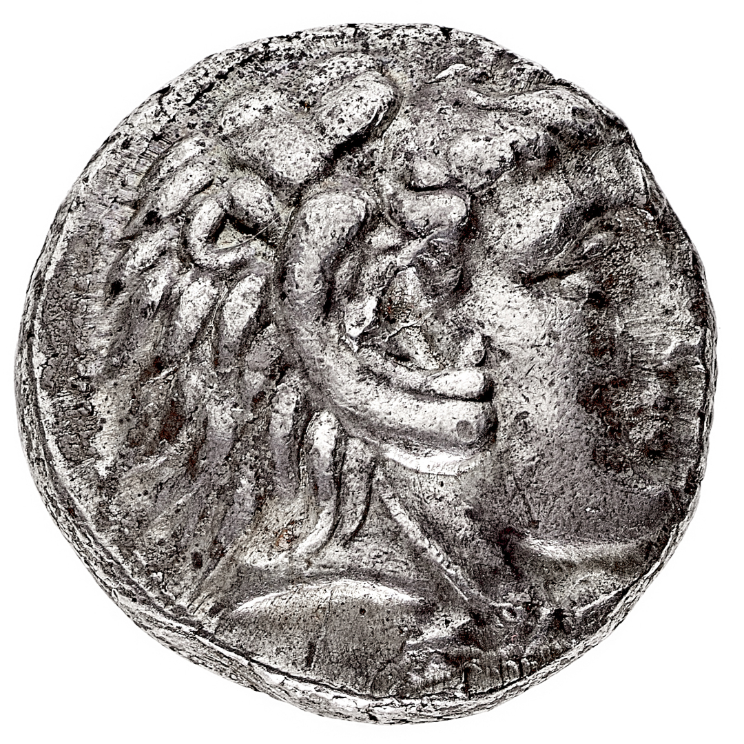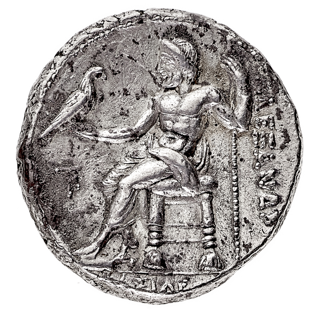 Alessandro III (336-323 a.C.) - Tetradramma databile al periodo 325-320 a.C. - Zecca: Kition - Diritto: testa di Eracle a destra ricoperta dalle fauci del leone - Rovescio: Zeus seduto a sinistra su un trono tiene un'aquila con la mano destra e un lungo scettro verticale con la sinistra;nel campo a sinistra un monogramma - gr. 17,19 - Graffito al rovescio, q.SPL
