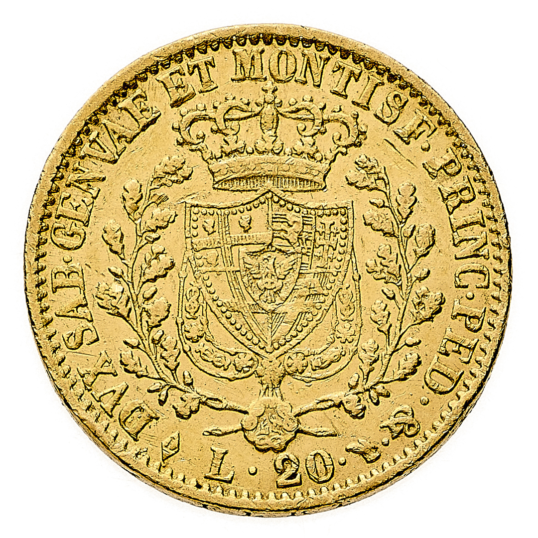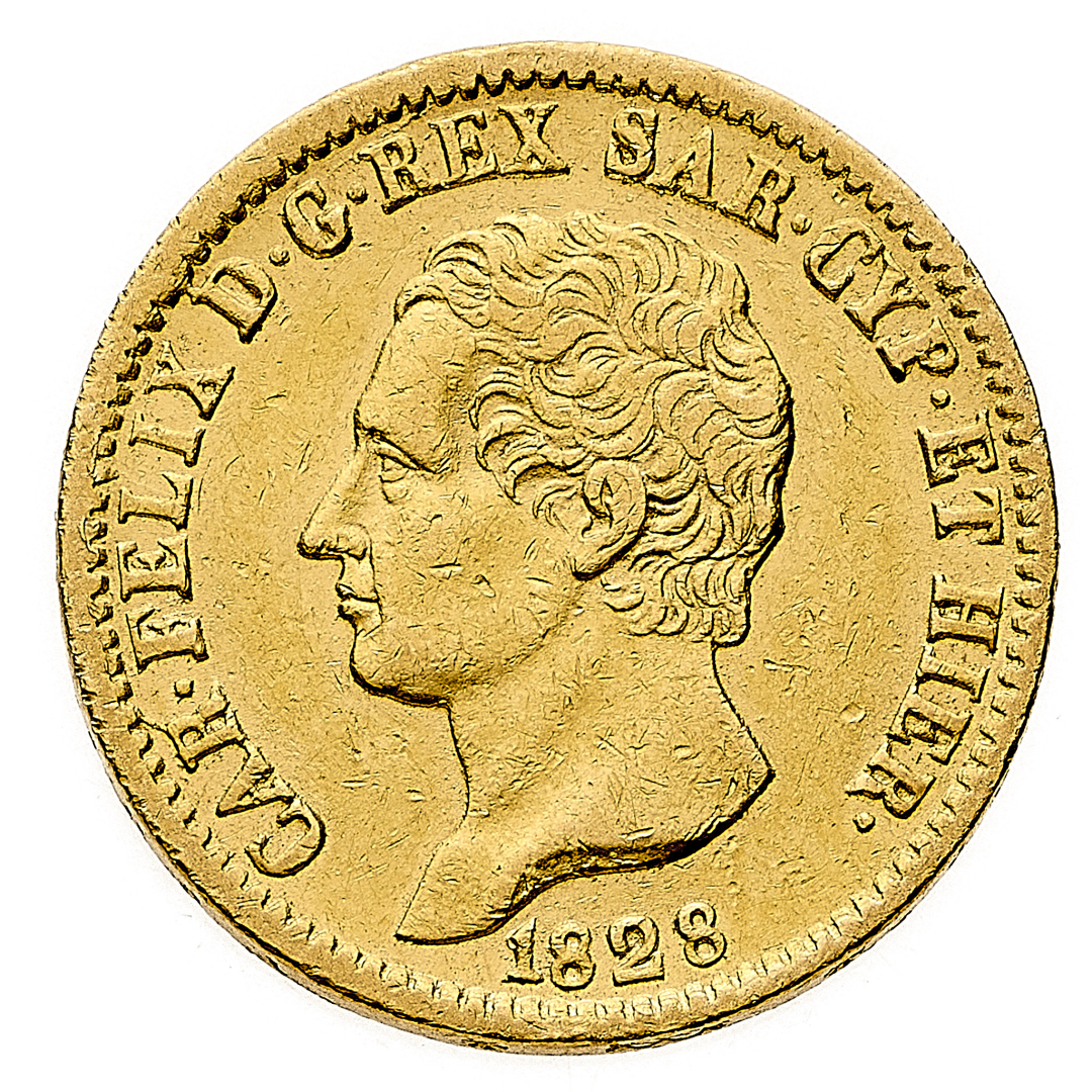 20 Lire 1828 - Zecca: Torino - Diritto: effigie del Re a sinistra - Rovescio: stemma completo di Casa Savoia coronato e circondato dal Collare dell'Annunziata - gr. 6,41 - q.SPL