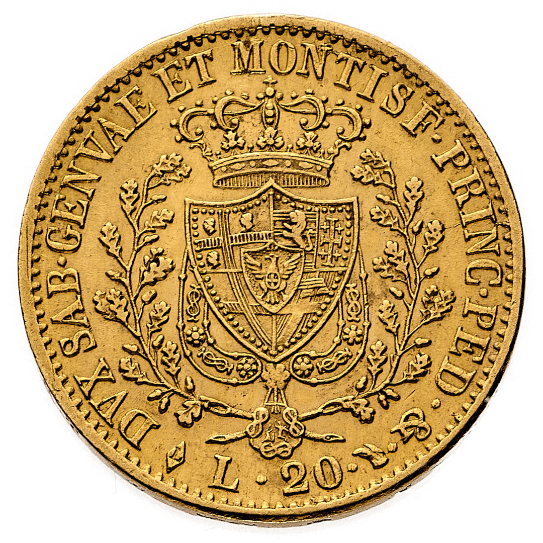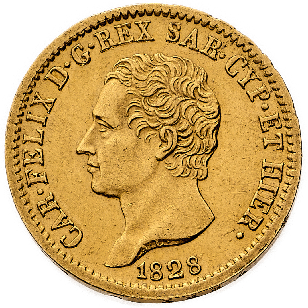20 Lire 1828 - Zecca: Torino - Diritto: effigie del Re a sinistra - Rovescio: stemma completo di Casa Savoia coronato e circondato dal Collare dell'Annunziata - gr. 6,42 - SPL
