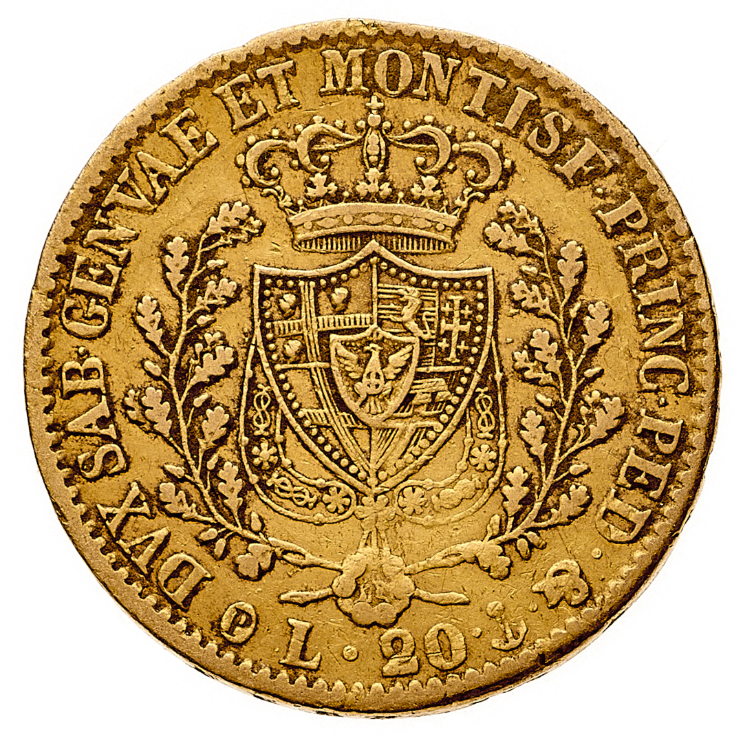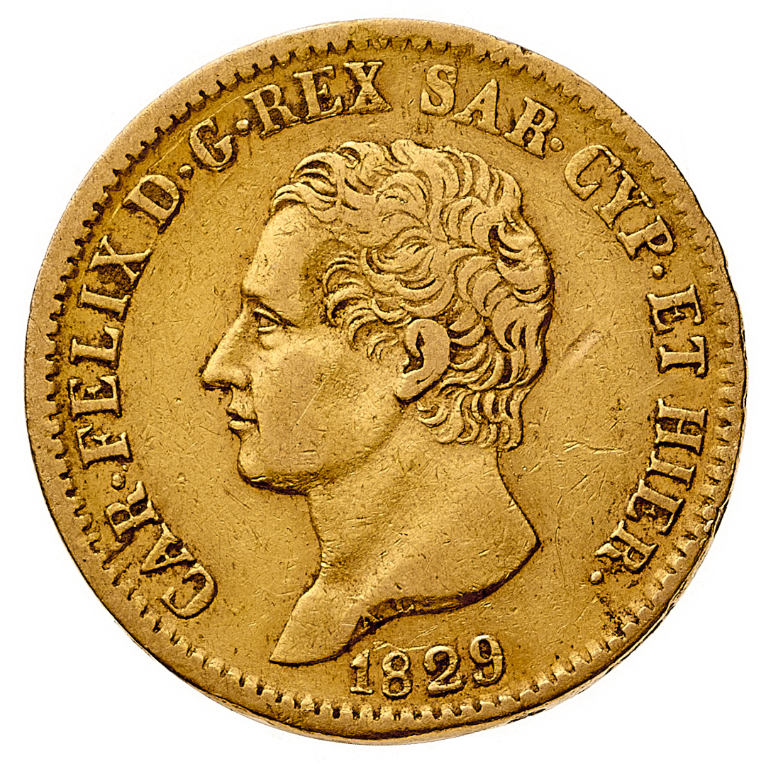 20 Lire 1829 - Zecca: Genova - Diritto: effigie del Re a sinistra - Rovescio: stemma completo di Casa Savoia coronato e circondato dal Collare dell'Annunziata - gr. 6,44 - Non comune - q.BB