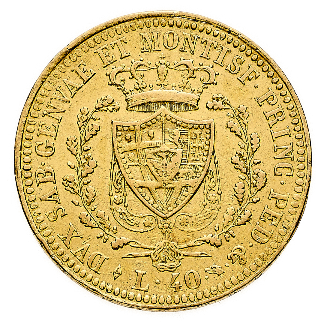 40 Lire 1822 - Zecca: Torino - Diritto: effigie del Re a sinistra - Rovescio: stemma completo di Casa Savoia coronato e circondato dal Collare dell'Annunziata - gr. 12,83 - Rara - Lievi colpetti al contorno, BB