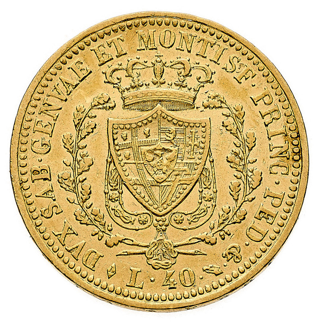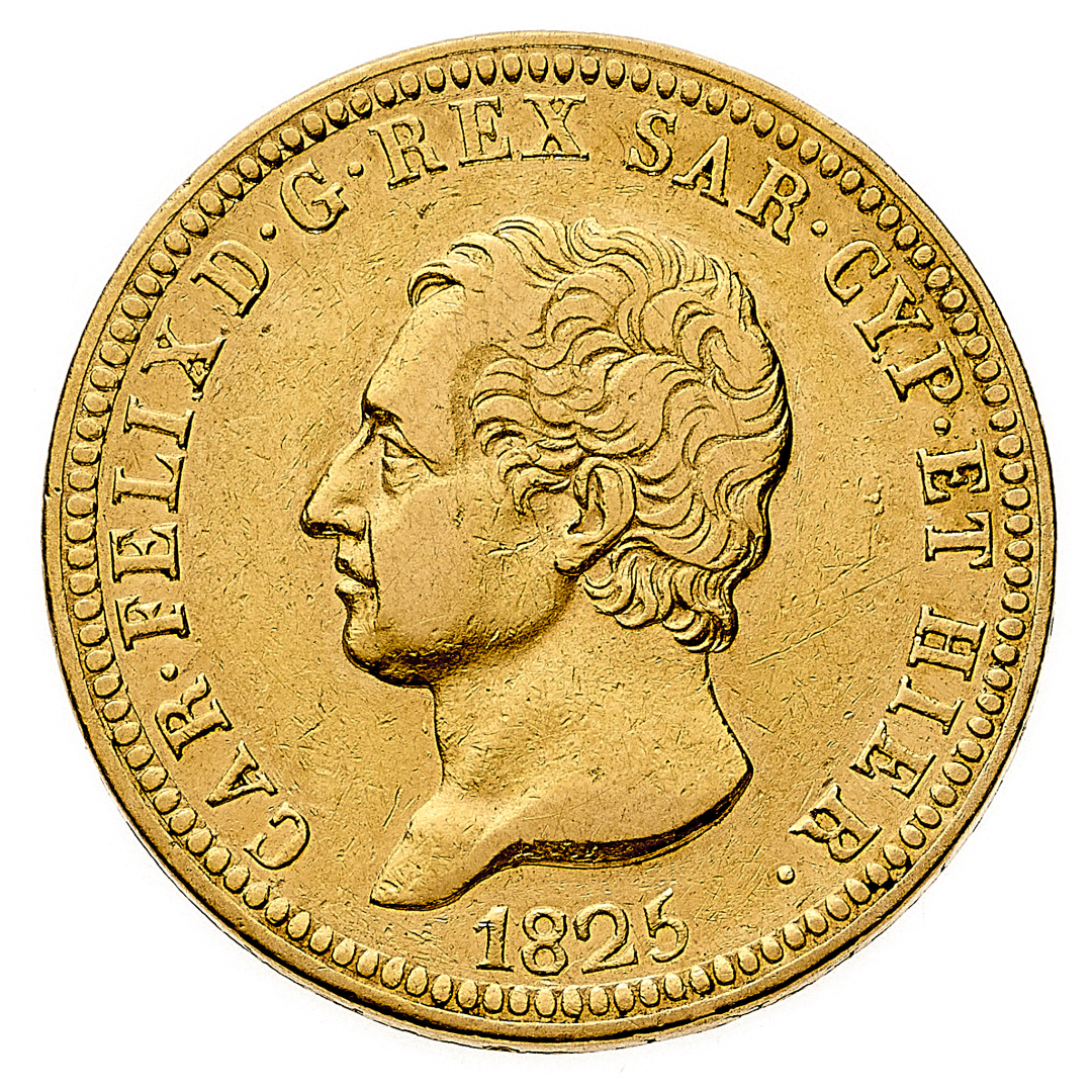 40 Lire 1825 - Zecca: Torino - Diritto: effigie del Re a sinistra - Rovescio: stemma completo di Casa Savoia coronato e circondato dal Collare dell'Annunziata - gr. 12,90 - BB