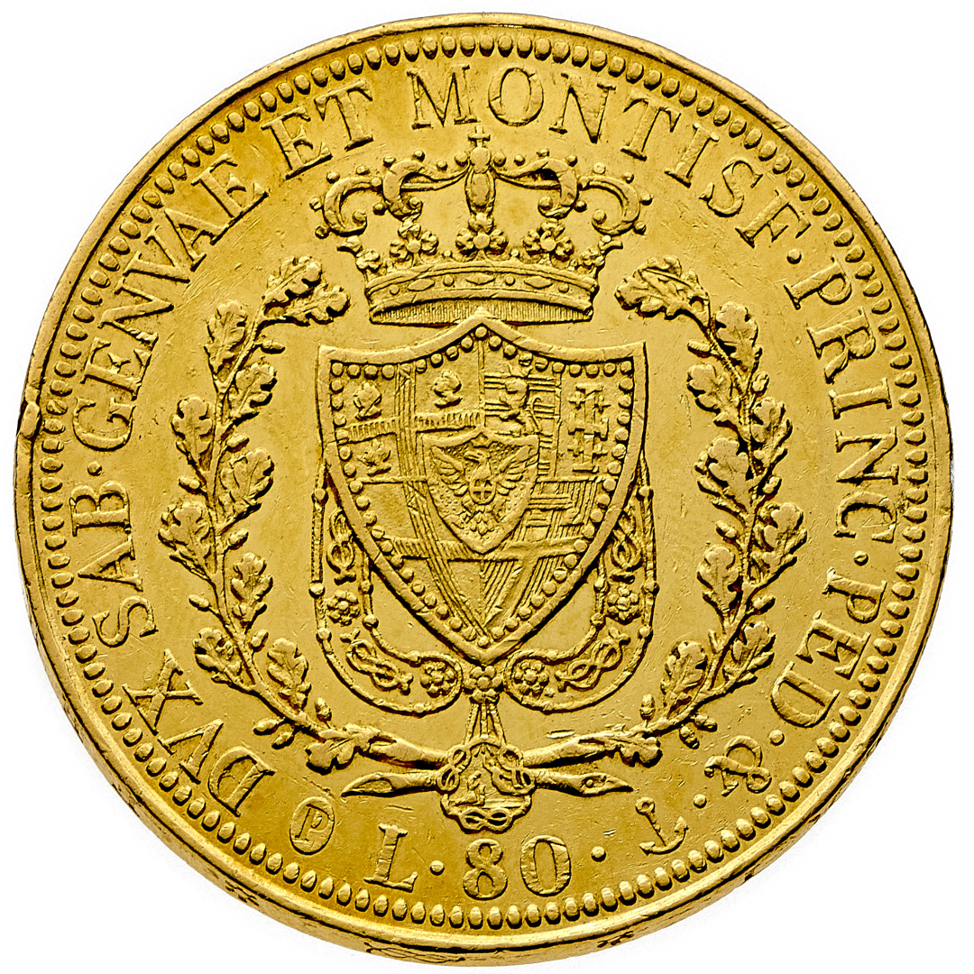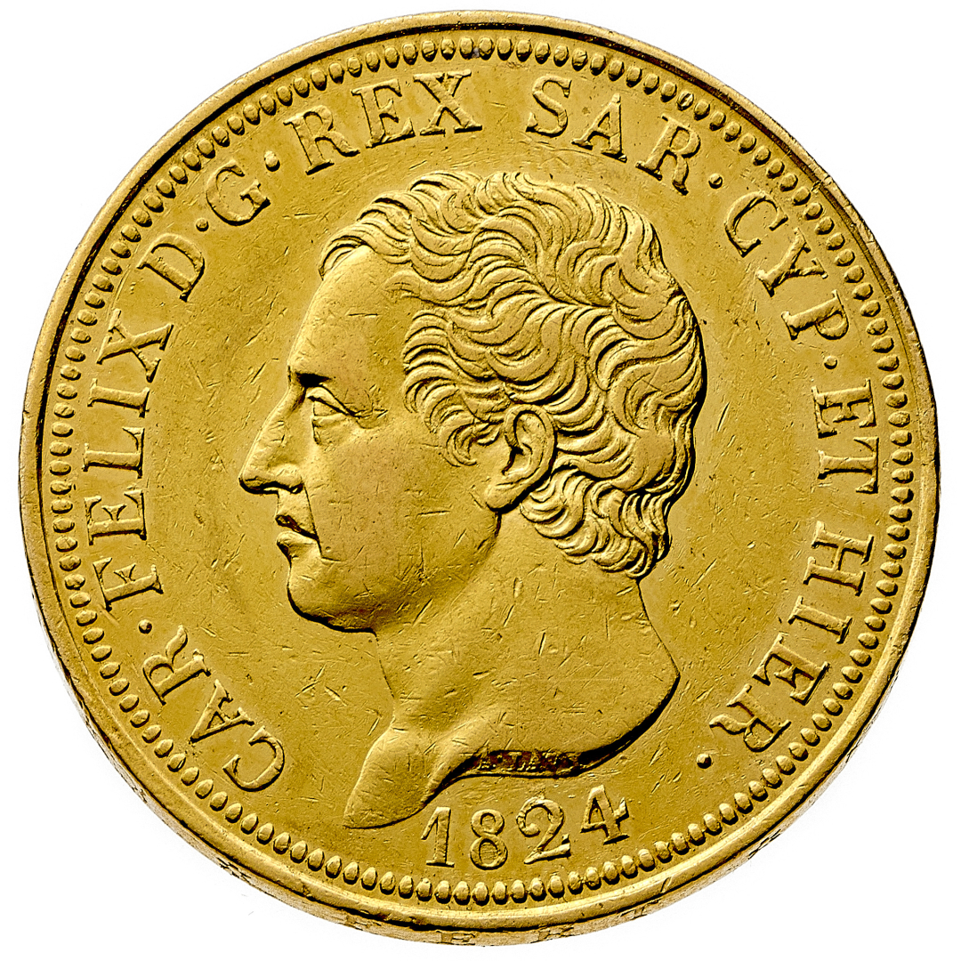 80 Lire 1824 - Zecca: Genova - Diritto: effigie del Re a sinistra - Rovescio: stemma completo di Casa Savoia coronato e circondato dal Collare dell'Annunziata entro due rami di quercia - gr. 25,77 - Rara - Lieve colpetto al contorno, migliore di BB
