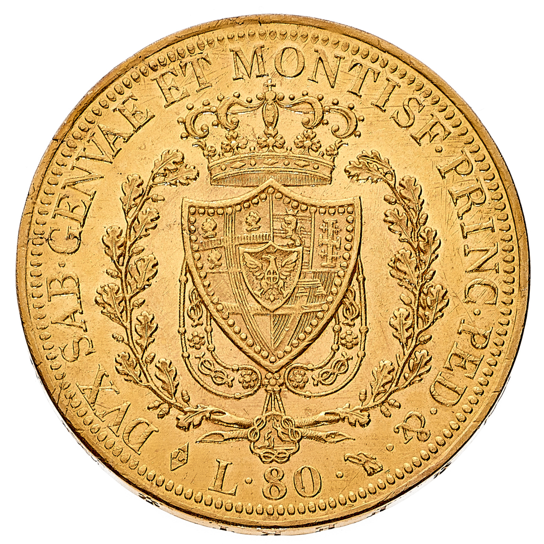 80 Lire 1824 - Zecca: Torino - Diritto: effigie del Re a sinistra - Rovescio: stemma completo di Casa Savoia coronato e circondato dal Collare dell'Annunziata entro due rami di quercia - gr. 25,79 - Non comune - Fondi lucenti, migliore di SPL