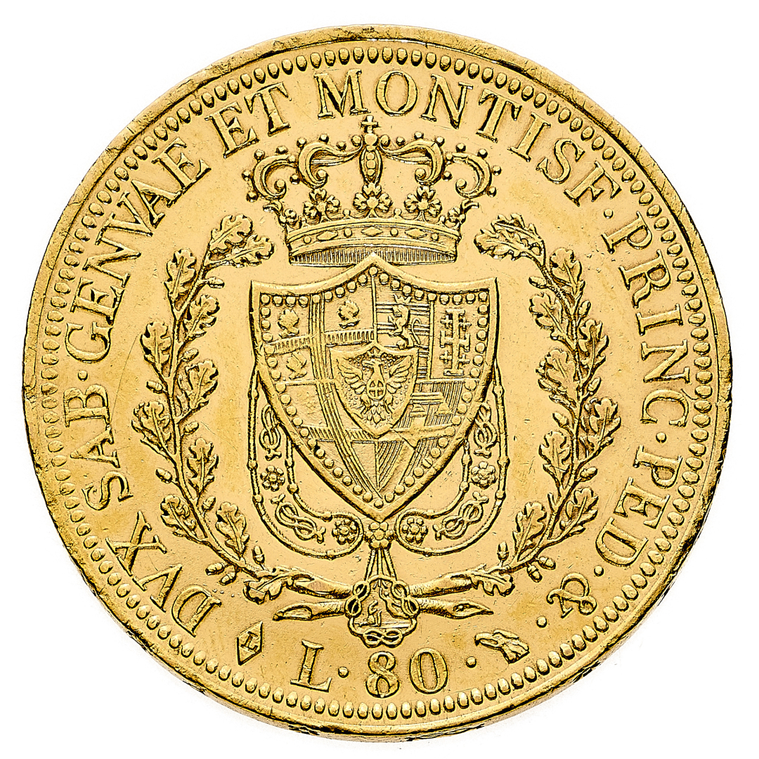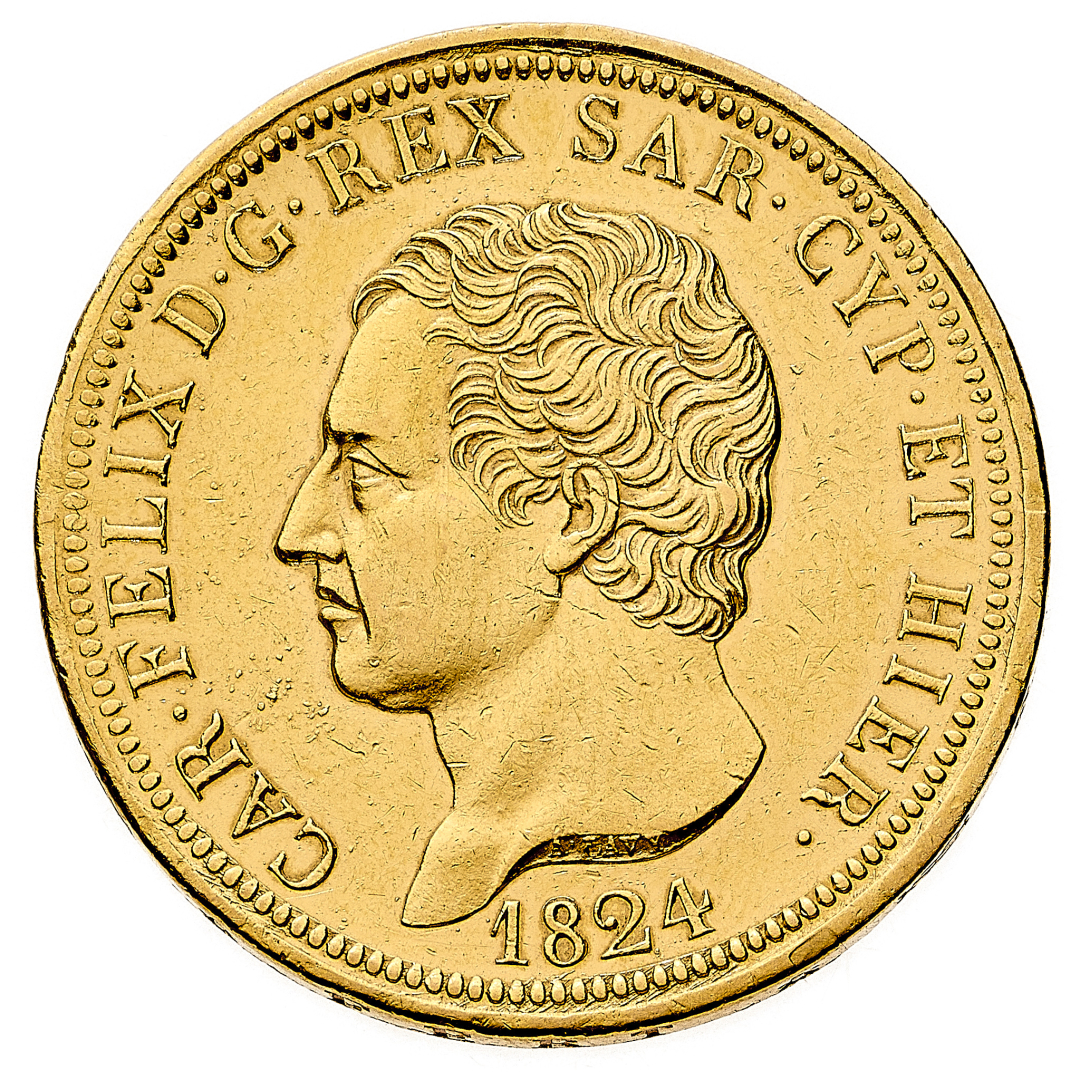 80 Lire 1824 - Zecca: Torino - Diritto: effigie del Re a sinistra - Rovescio: stemma completo di Casa Savoia coronato e circondato dal Collare dell'Annunziata - gr. 25,80 - Non comune - q.SPL