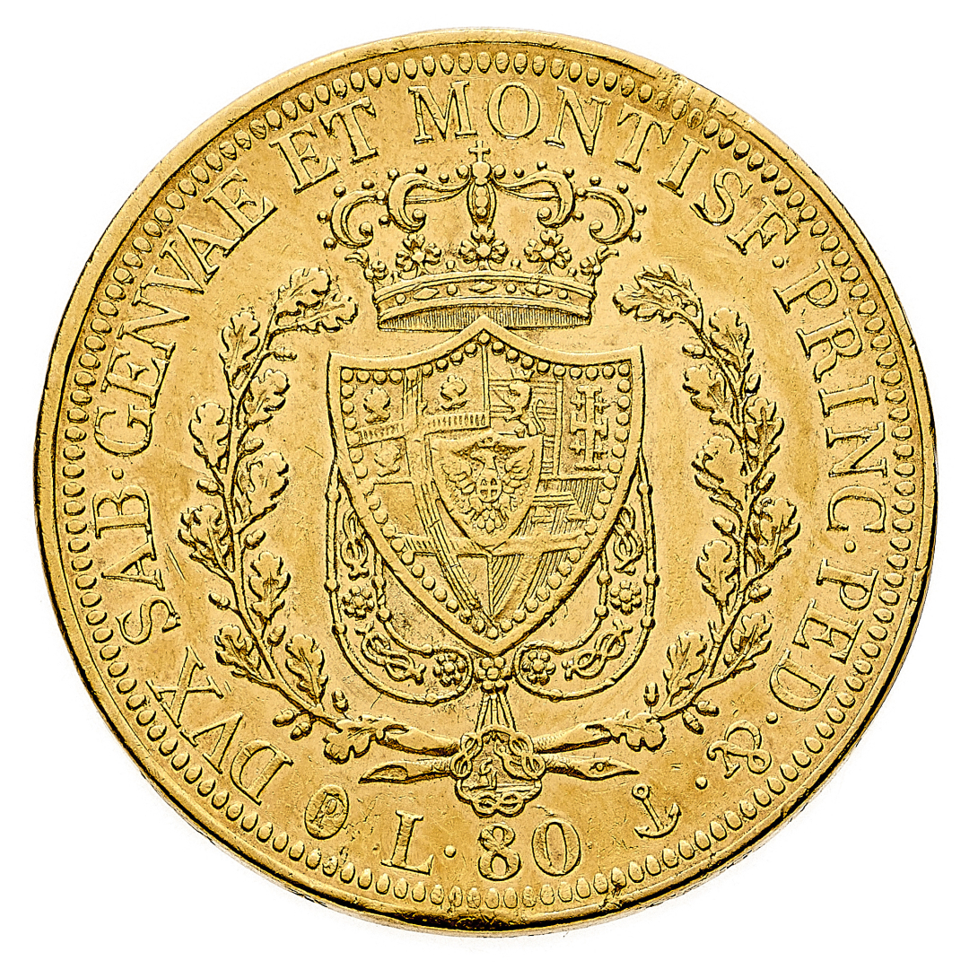 80 Lire 1825 - Zecca: Genova - Diritto: effigie del Re a sinistra - Rovescio: stemma completo di Casa Savoia coronato e circondato dal Collare dell'Annunziata - gr. 25,72 - BB