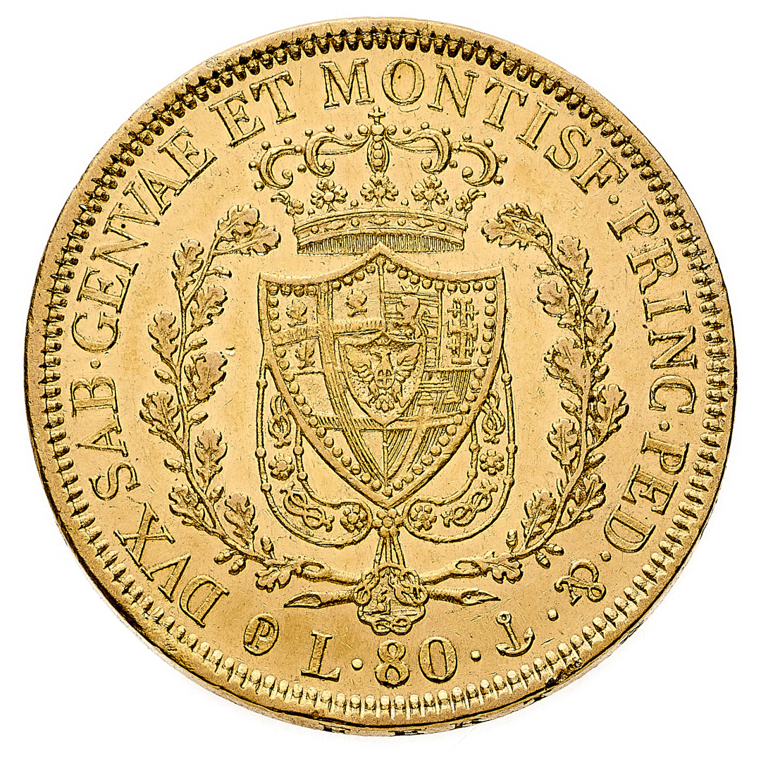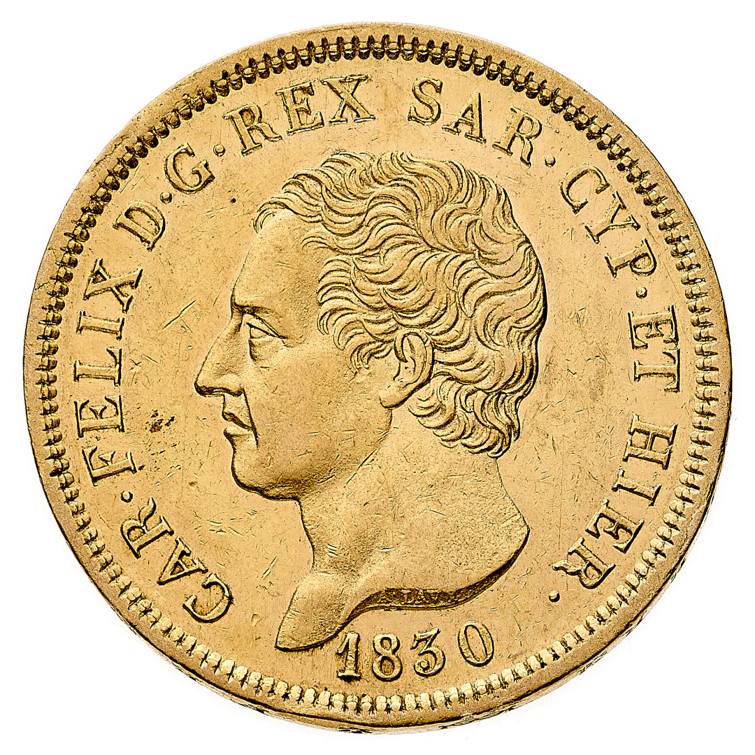80 Lire 1830 - Zecca: Genova - Diritto: effigie del Re a sinistra - Rovescio: stemma completo di Casa Savoia coronato e circondato dal Collare dell'Annunziata - gr. 25,80 - Fondi lucenti, SPL