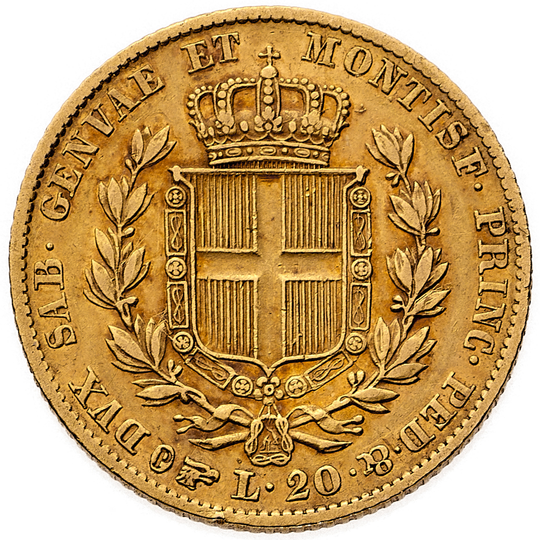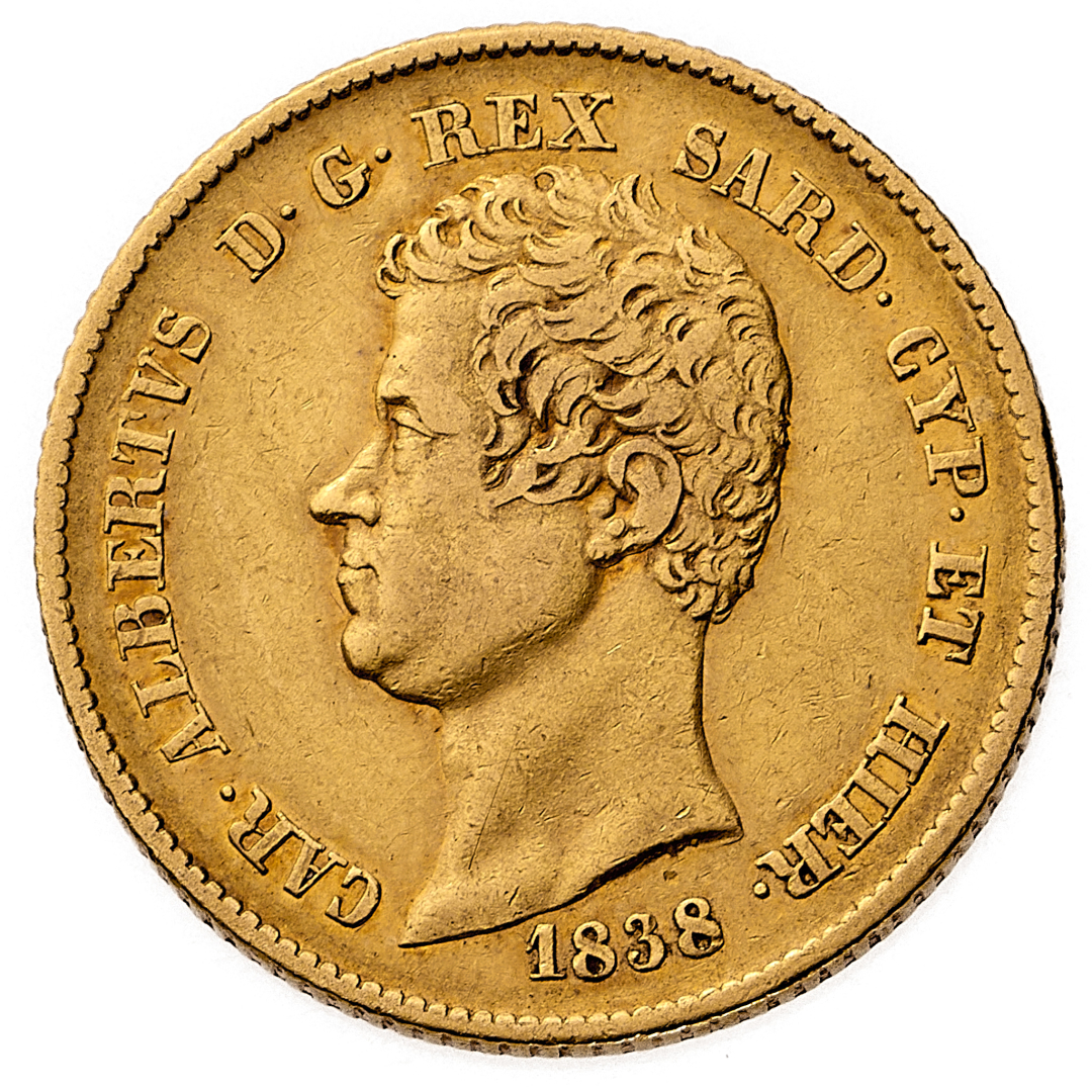 20 Lire 1838 - Zecca: Torino - Diritto: effigie del Re a sinistra - Rovescio: stemma di Casa Savoia coronato e circondato dal Collare dell'Annunziata - gr. 6,45 - Non comune - Migliore di BB
