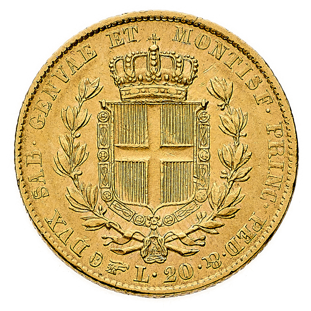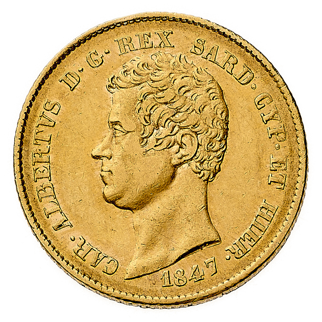 20 Lire 1847 - Zecca: Torino - Diritto: effigie del Re a sinistra - Rovescio: stemma di Casa Savoia coronato e circondato dal Collare dell'Annunziata - gr. 6,45 - q.SPL