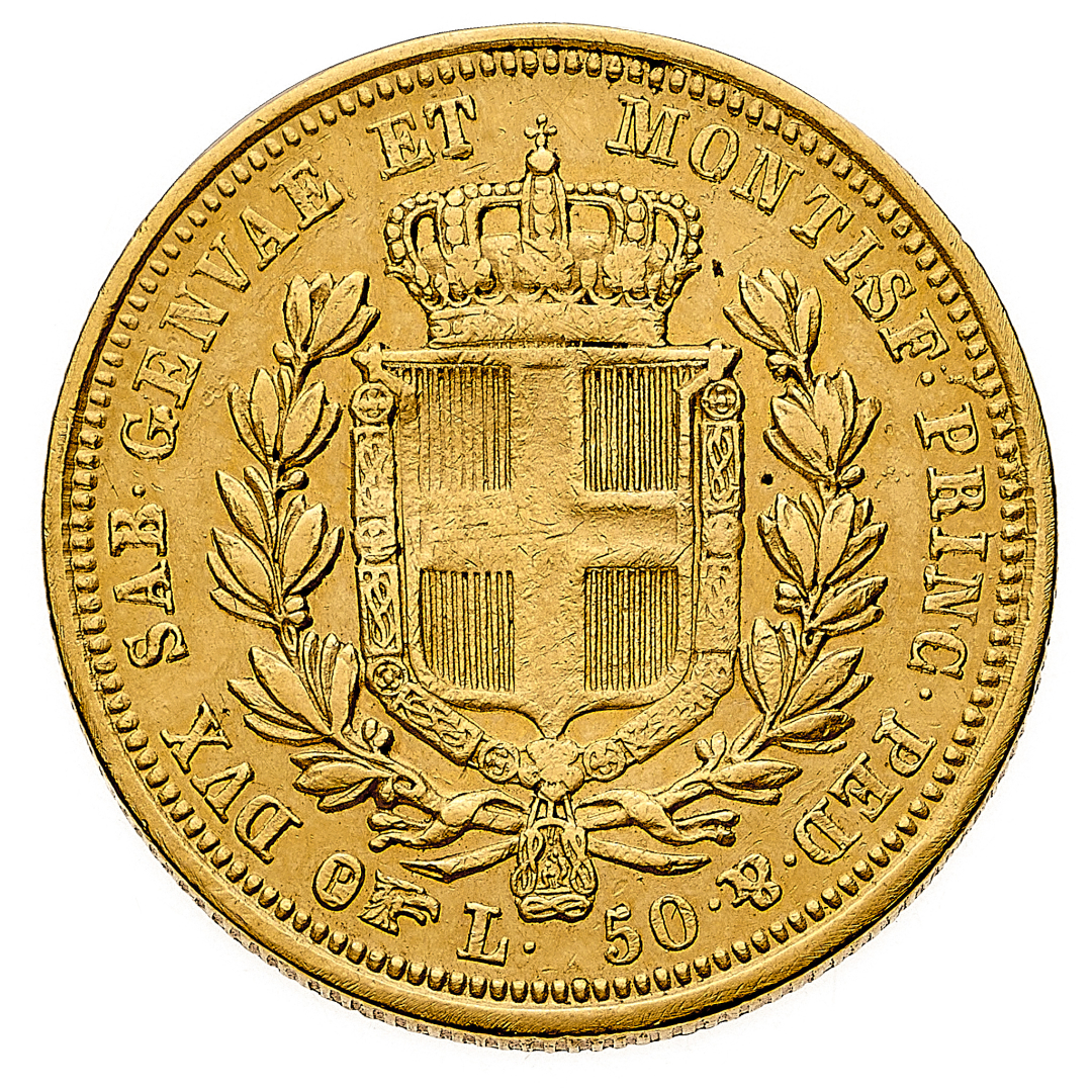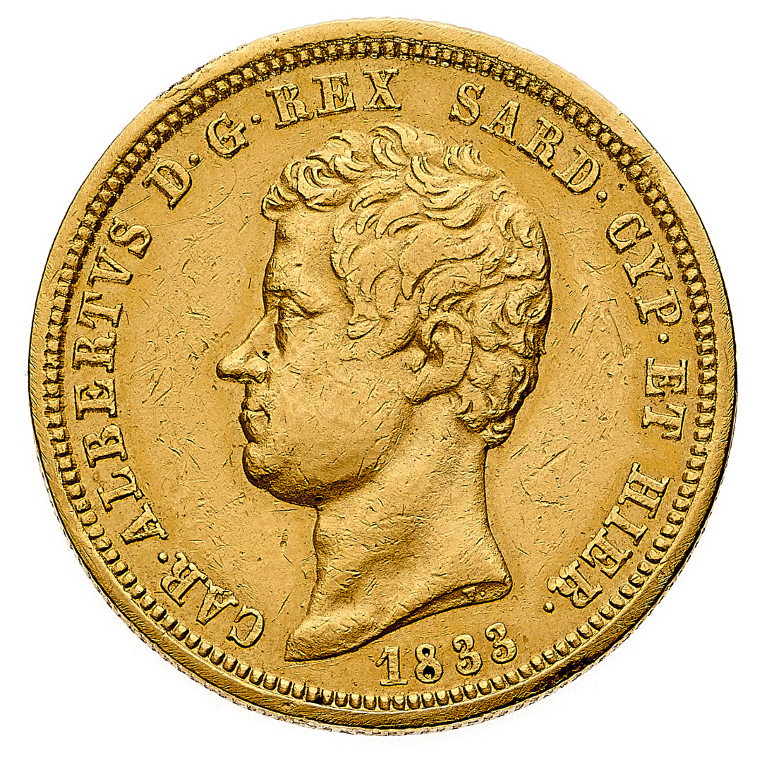 50 Lire 1833 - Zecca: Torino - Diritto: effigie del Re a sinistra - Rovescio: stemma di Casa Savoia coronato e circondato dal Collare dell'Annunziata - gr. 16,05 - Rara - BB