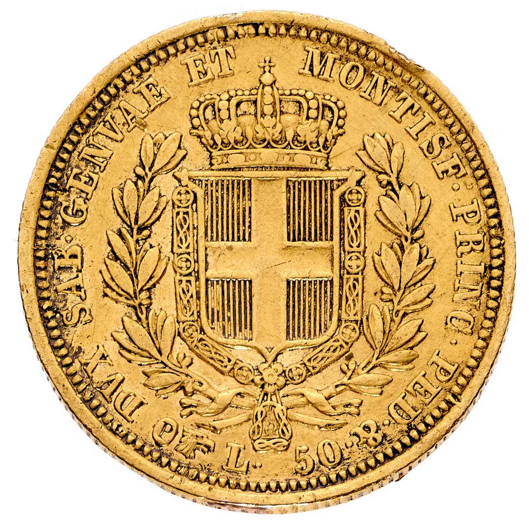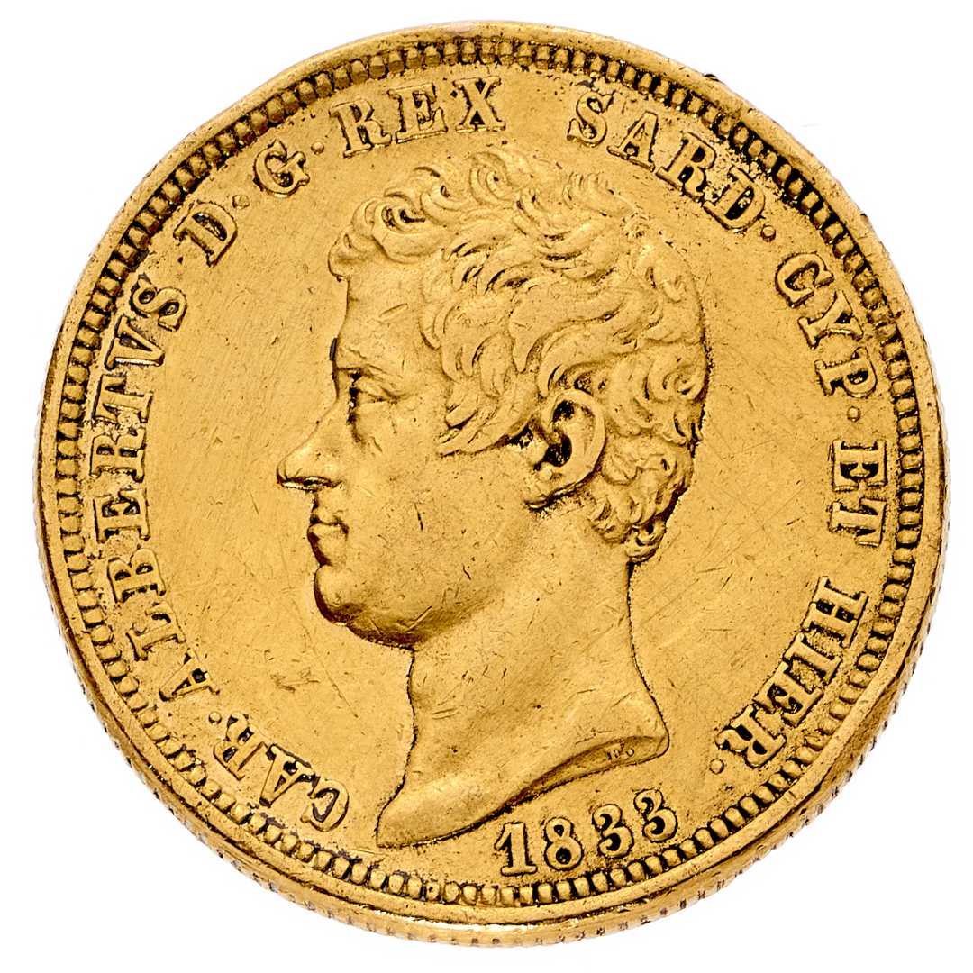 50 Lire 1833 - Zecca: Torino - Diritto: effigie del Re a sinistra - Rovescio: stemma di Casa Savoia coronato e circondato dal Collare dell'Annunziata - gr. 15,94 - Rara - Tracce di montatura, BB