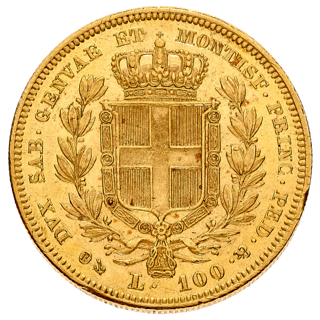 100 Lire 1834 - Zecca: Genova - Diritto: effigie del Re a sinistra - Rovescio: stemma di Casa Savoia coronato e circondato dal Collare dell'Annunziata - gr. 32,25 - Lievi segni di contatto ma fondi lucenti, q.FDC