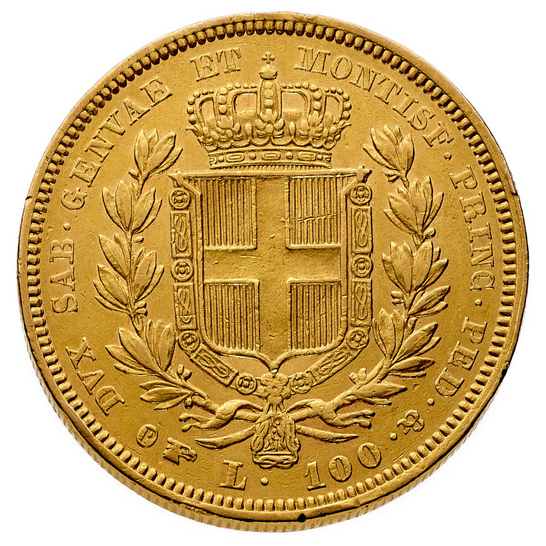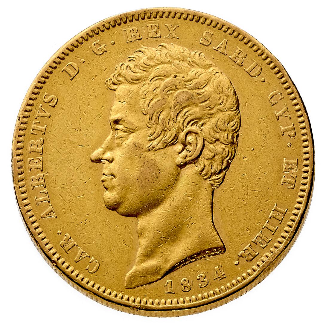 100 Lire 1834 - Zecca: Torino - Diritto: effigie del Re a sinistra - Rovescio: stemma di Casa Savoia coronato e circondato dal Collare dell'Annunziata - gr. 32,19 - Lievi colpetti al contorno, migliore di BB