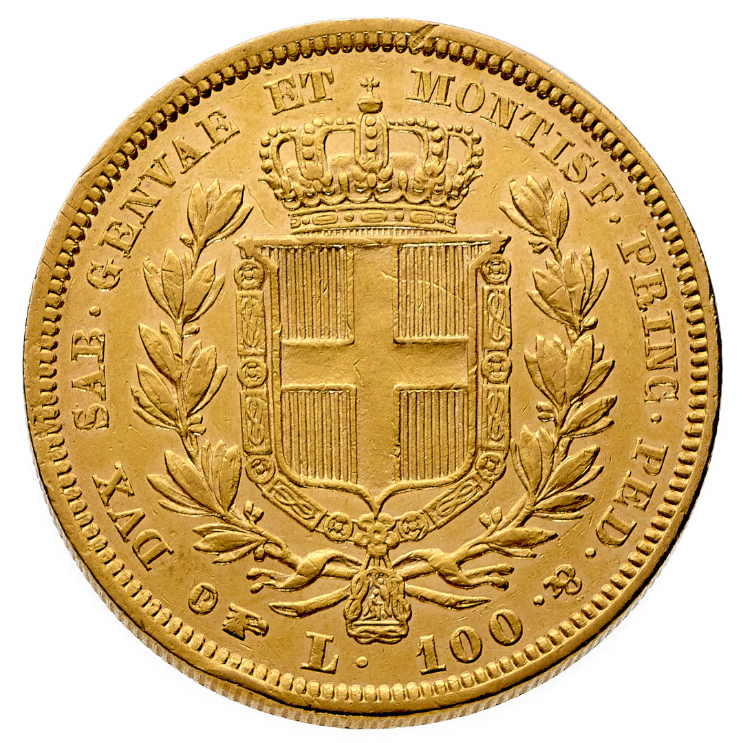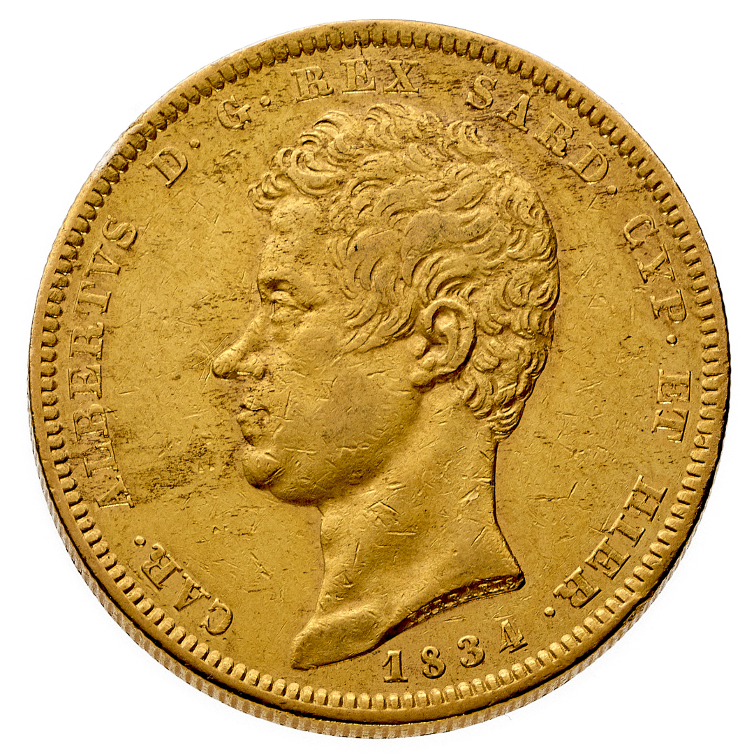 100 Lire 1834 - Zecca: Torino - Diritto: effigie del Re a sinistra - Rovescio: stemma di Casa Savoia coronato e circondato dal Collare dell'Annunziata - gr. 32,22 - Lieve colpetto al contorno, migliore di BB