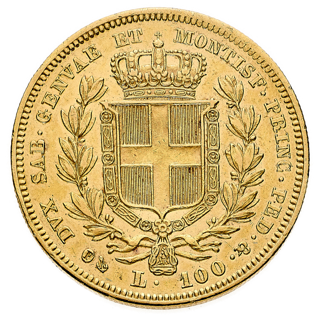 100 Lire 1835 - Zecca: Genova - Diritto: effigie del Re a sinistra - Rovescio: stemma di Casa Savoia coronato e circondato dal Collare dell'Annunziata - gr. 32,25 - Lieve colpetto al contorno, q.SPL