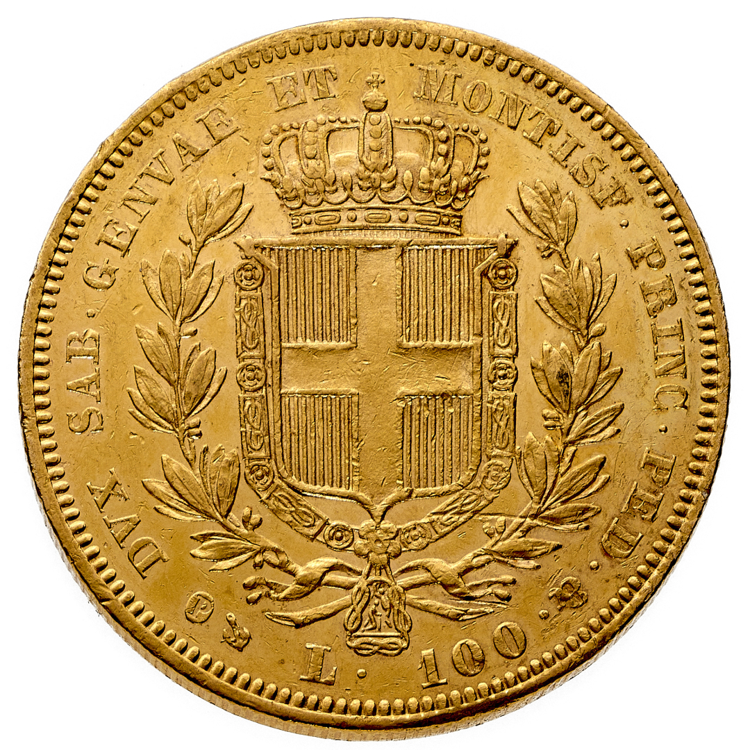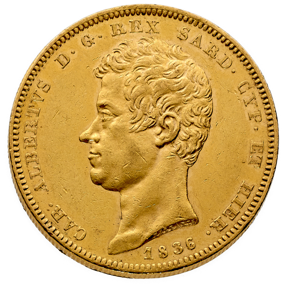 100 Lire 1836 - Zecca: Genova - Diritto: effigie del Re a sinistra - Rovescio: stemma di Casa Savoia coronato e circondato dal Collare dell'Annunziata - gr. 32,26 - Lievi segni di contatto, SPL