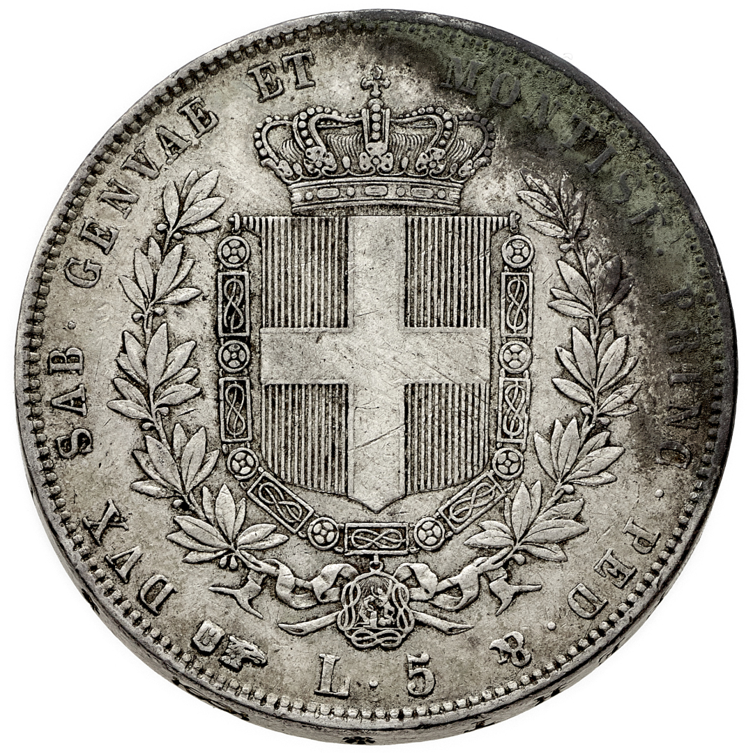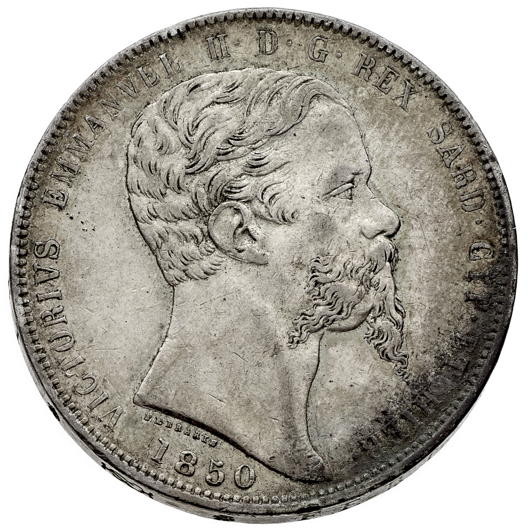 5 Lire 1850 - Zecca: Torino - Diritto: effigie del Re a destra - Rovescio: stemma di Casa Savoia coronato e circondato dal Collare dell'Annunziata - gr. 24,98 - Rara - Lievi depositi, migliore di BB