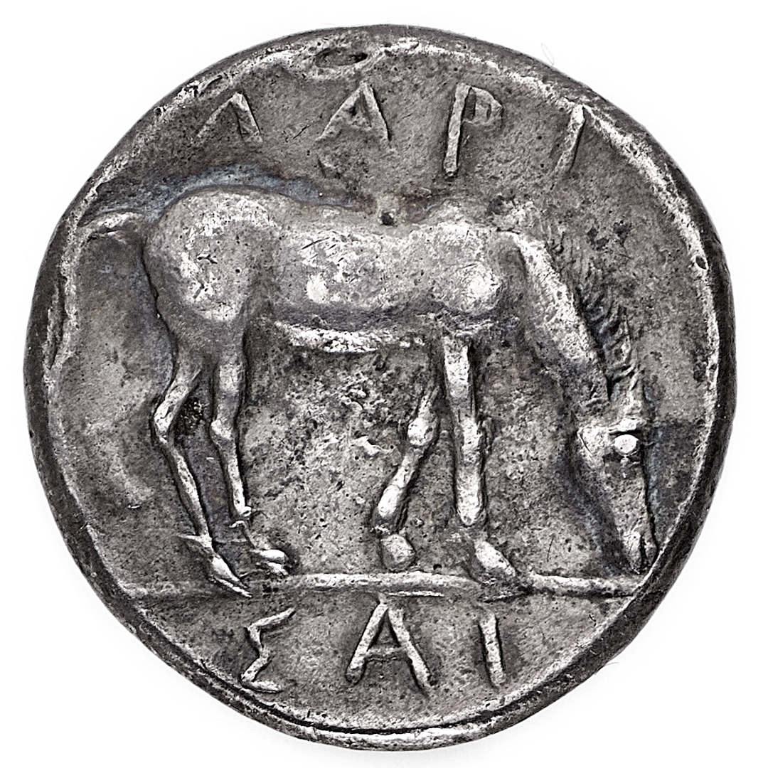 Larissa - Dracma databile al periodo 361-353 a.C. - Diritto: testa della ninfa Larissa di fronte - Rovescio: cavallo verso destra nell'atto di brucare l'erba - gr. 5,81 - Non comune - Patina di medagliere, q.SPL - Proveniente dall'asta Dr. Busso Peus Nachf. 398, Frankfurt am Main 28.4.2008, n. 171