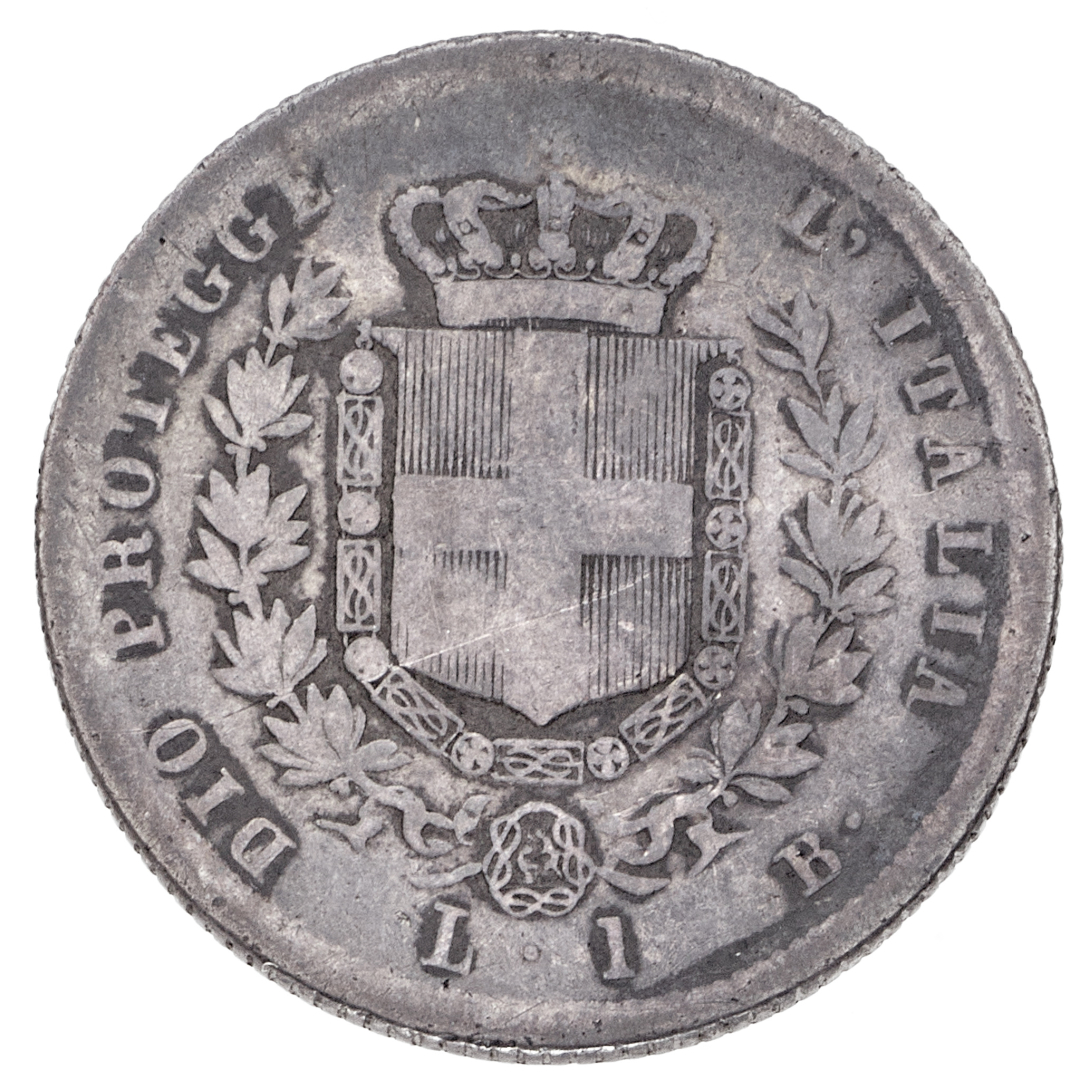 Emissioni delle Regie Provincie dell'Emilia - 1 Lira 1859 - Zecca: Bologna - Diritto: effigie del Re a destra - Rovescio: stemma completo di Casa Savoia coronato e circondato dal Collare dell'Annunziata - gr. 4,75 - MB