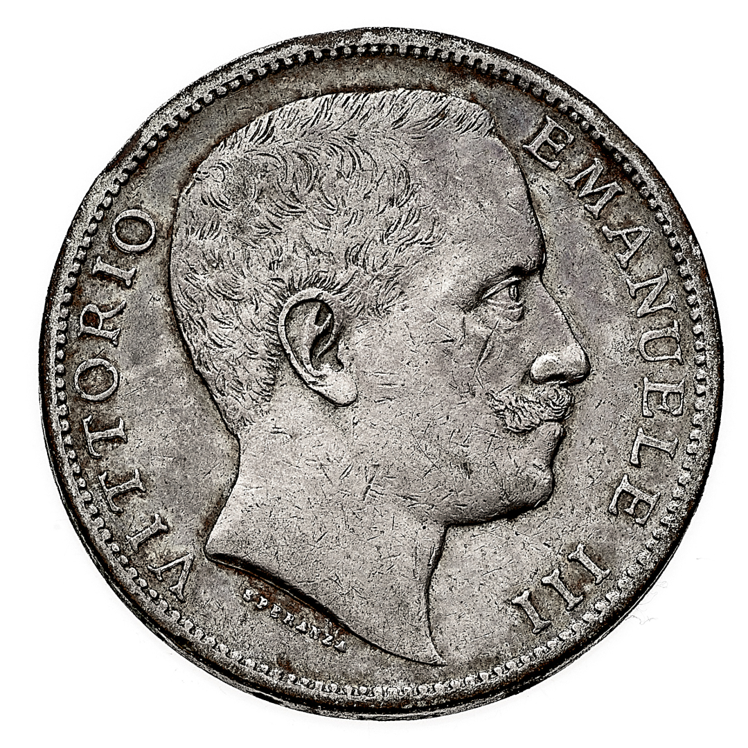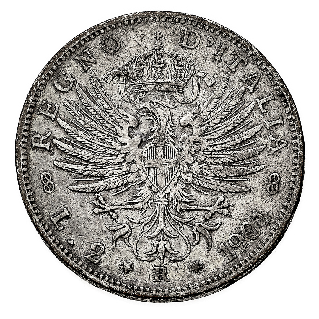 2 Lire Aquila Sabauda 1901 - Zecca: Roma - Diritto: effigie del Re a destra - Rovescio: aquila coronata ad ali spiegate con stemma sabaudo in petto - gr. 9,98 - Rara - Migliore di BB