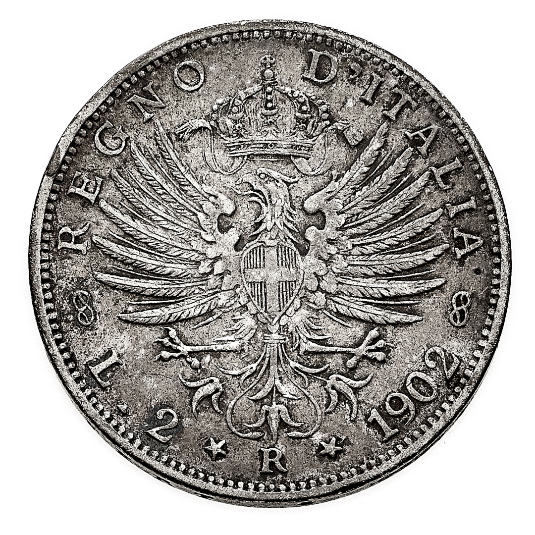 2 Lire Aquila Sabauda 1902 - Zecca: Roma - Diritto: effigie del Re a destra - Rovescio: aquila coronata ad ali spiegate con stemma sabaudo in petto - gr. 9,98 - Rara - q.SPL