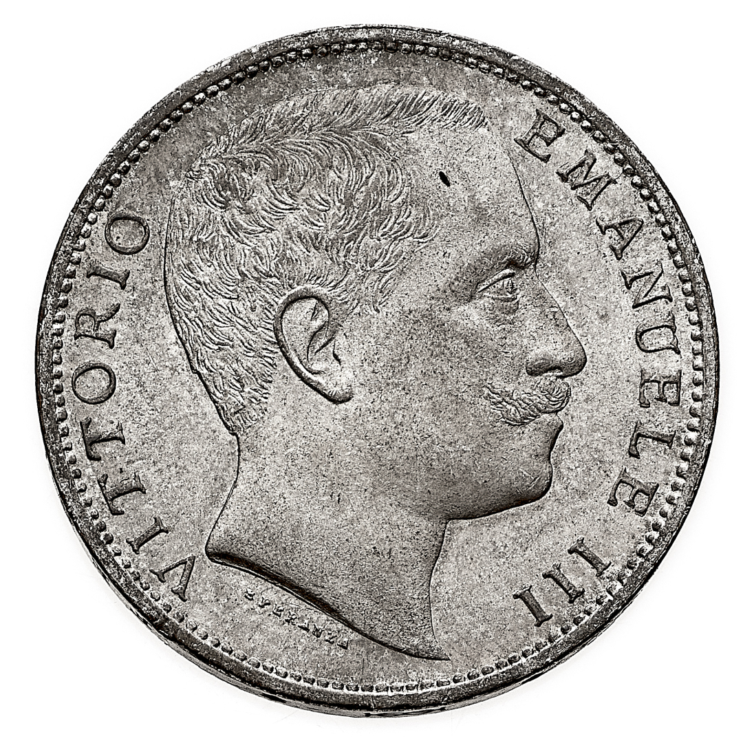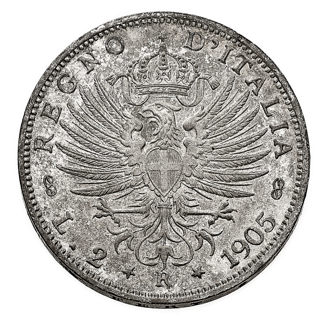 2 Lire Aquila Sabauda 1905 - Zecca: Roma - Diritto: effigie del Re a destra - Rovescio: aquila coronata ad ali spiegate con stemma sabaudo in petto - gr. 9,98 - Patina iridescente, praticamente FDC
