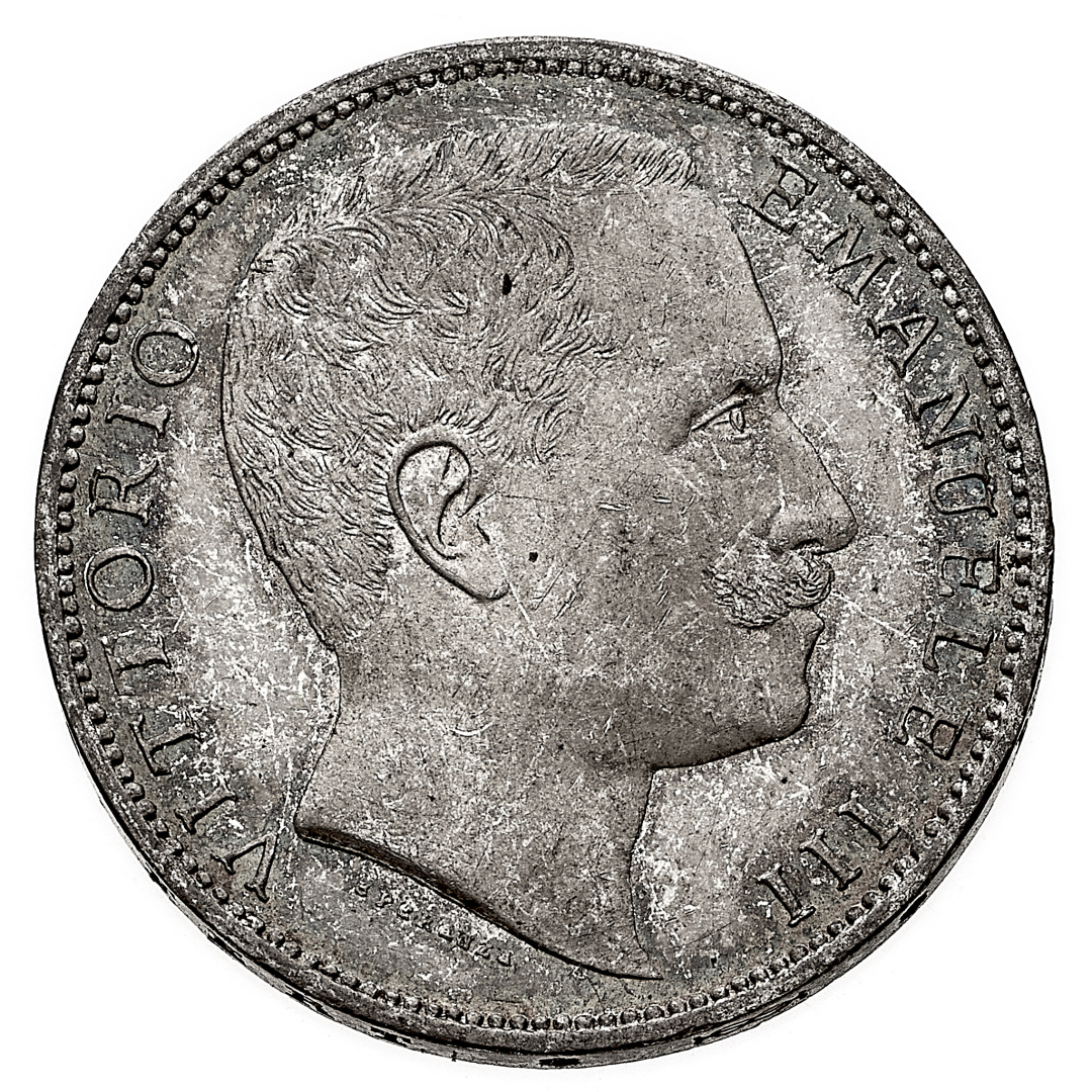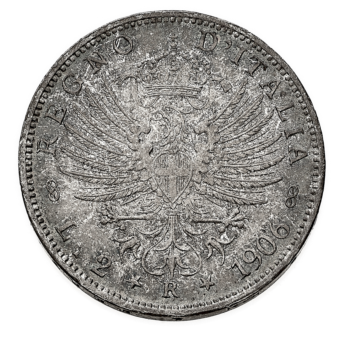2 Lire Aquila Sabauda 1906 - Zecca: Roma - Diritto: effigie del Re a destra - Rovescio: aquila coronata ad ali spiegate con stemma sabaudo in petto - gr. 9,98 - Patina iridescente, q.FDC