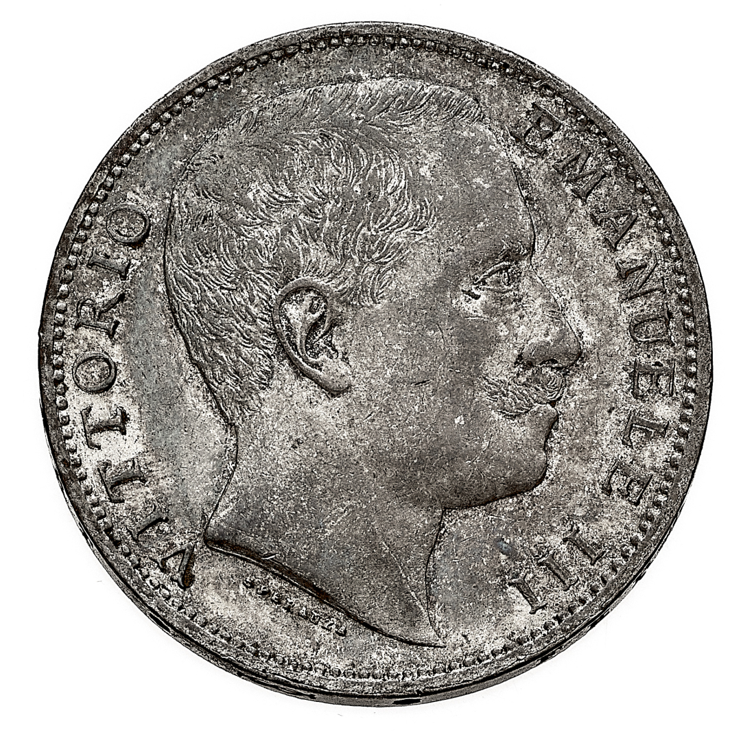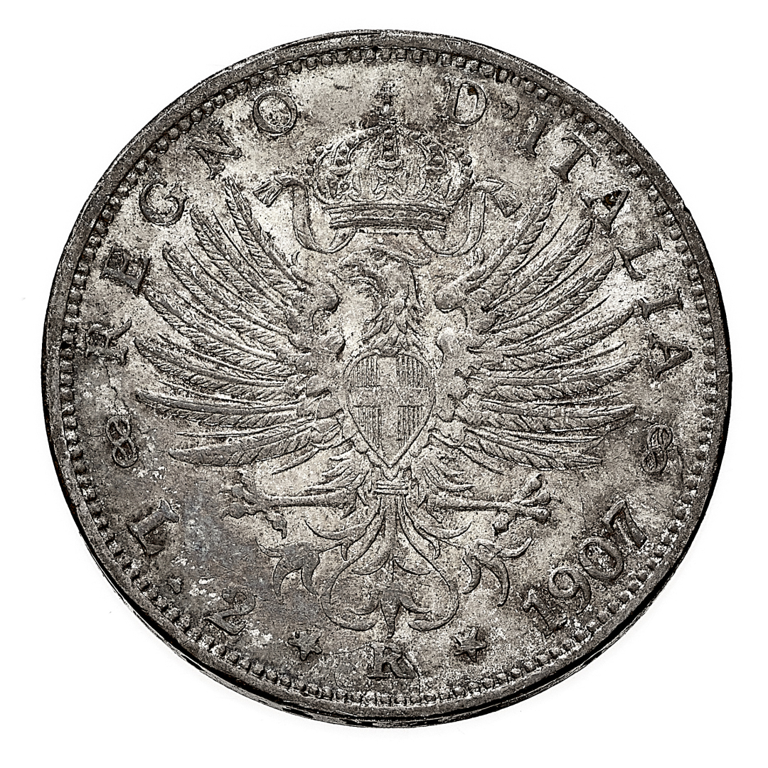 2 Lire Aquila Sabauda 1907 - Zecca: Roma - Diritto: effigie del Re a destra - Rovescio: aquila coronata ad ali spiegate con stemma sabaudo in petto - gr. 9,98 - Patina iridescente, q.FDC